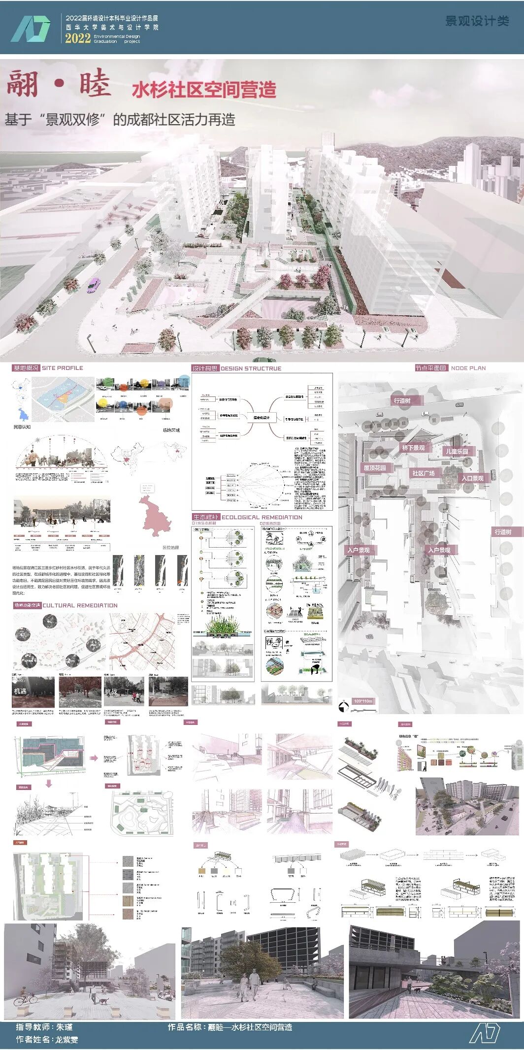 本设计选择了水杉社区作为研究对象。以社区空间为主题,彰显“以人为本”的设计理念,运用“微更新”的设计手法,对水杉社区的空间景观进行改造,包括整体设计、水杉社区空间景观规划、水杉社区空间景观空间功能分析、水杉社区空间景观专项设计等。通过本次设计,可以比较完整、系统地展示社区景观空间设计布局的整体风格,体现设计的传统特色和新的设计理念。最终实现社会利益的提升、文化的传承、人居情怀的传递、邻里关系与和谐的构建等精神生产力的再生产。