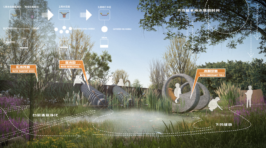 本次设计选址于四川省成都市西华大学,以探究海绵城市视角下的校园改造为主,通过实地调研分析校园现有水系状况,针对新校区存在的现状问题,提出相应的改造措施。基于海绵城市功能下,结合场地的自身的自然地理优势,大面积的绿化,人工湖与河道,以及湿润适宜植物生长的气候,依托原有格局进行造景和功能安排,再提取场地的历史文化记忆,融入设计细节中,形成一个以水域为依托的连贯的校园生态网络系统,并为师生和当地居民打造了一个可观赏、休憩、游乐的场所