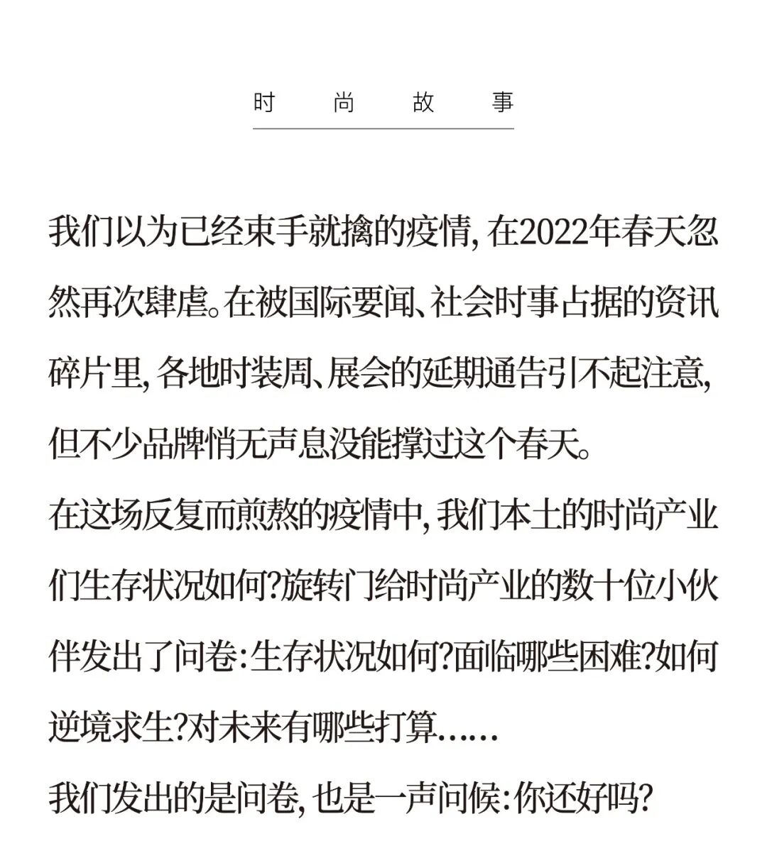 也有一些品牌能维持基本的正常营业。PANTTERFLY合作的全国150多家买手店都开着,但现金流还是紧张;设计师品牌HAIZHEN WANG全国有几百家合作买手渠道,创始人王海震说,对于强调穿衣感受和体验的时尚行业来说,隔离、封闭是致命的打击;溢达集团旗下品牌十如仕的10家直营店全开,员工全部在岗,但销售状况也难言满意;某知名上市时尚集团,全国700家店里有630多家正常营业,比例不可谓不高。但集团副总裁A先生吐槽说,大多数门店人流剧减,销售额明显下滑……