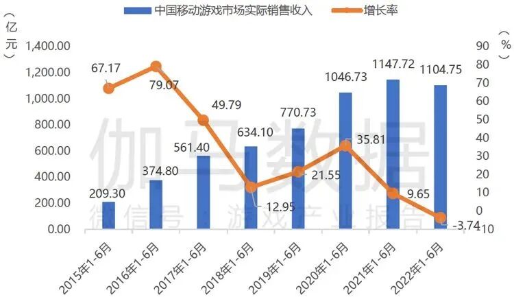 2022年1~6月,中国移动游戏市场实际销售收入1104.75亿元,与去年同期相比有所回落,同比减少3.74%。