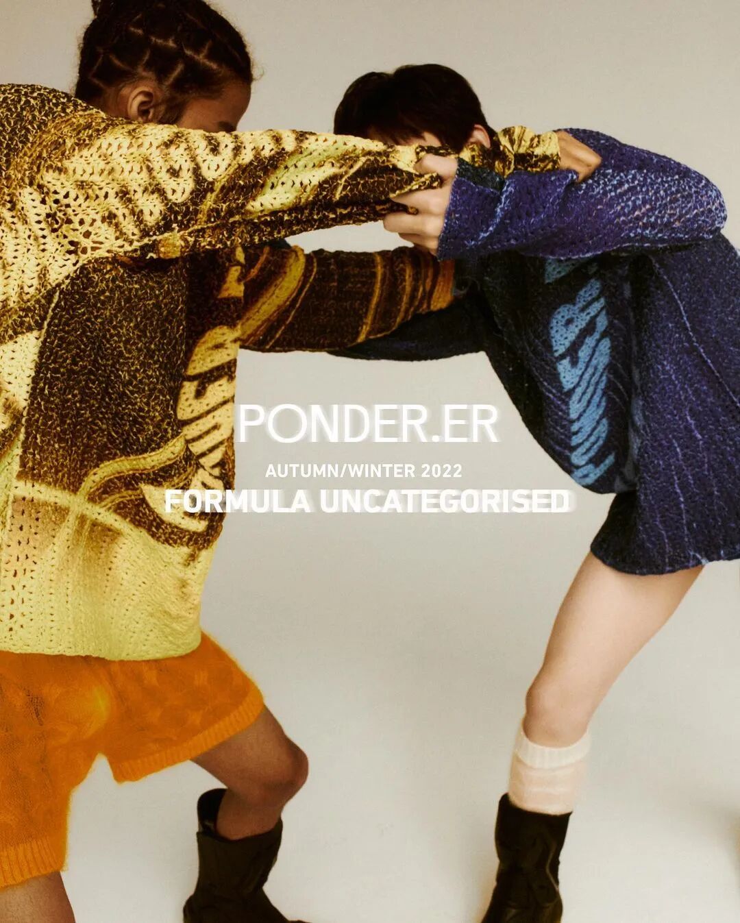 PONDER.ER是Alex Po(浦加林)和Derek Cheng(郑仲曦)于2019年创立的品牌。他们在中央圣马丁学院学习时相识。之后,Po在皇家艺术学院专攻男性针织方向,进一步提高了他的技能,扩展了他的视野。