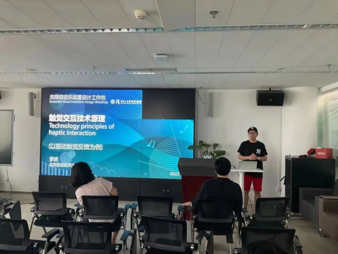 7月5日早10:00,工作坊邀请3位专家老师开设专题讲座,为工作坊成员拓展不同角度的技术思路。来自北京航空航天大学的博士生罗虎讲述了触觉交互技术原理。来自中央音乐学院的刘昊老师通过多个不同案例分享,展现了交互音乐媒体设计的多种样式,同时通过专业技术的实验分析为工作坊成员提供了技术思路。来自视感科技的骆石川,通过打造国民级乐器电子消费产品的实战案例,引导成员在设计时能够考虑到市场的趋势、洞察目标用户的需求。