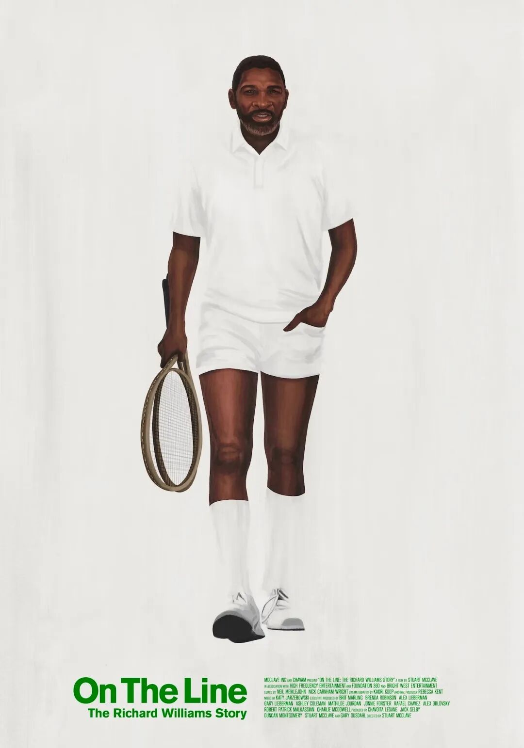 画面中网球名将理查威廉斯自信地往前迈开步伐,一袭白色装扮体现了主角的坚韧与自信,手里拿着两个球拍,传达了主角身为网球教练,也展现出他为黑人争取运动平权、刚毅不屈的气场。
