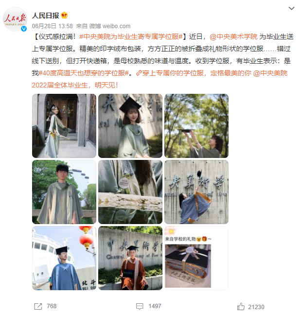 前段时间逛微博,看到人民日报报道了央美学士服,点开一看,真是非常精致。不禁再次感慨,真是生不逢时,毕业太早鸭!