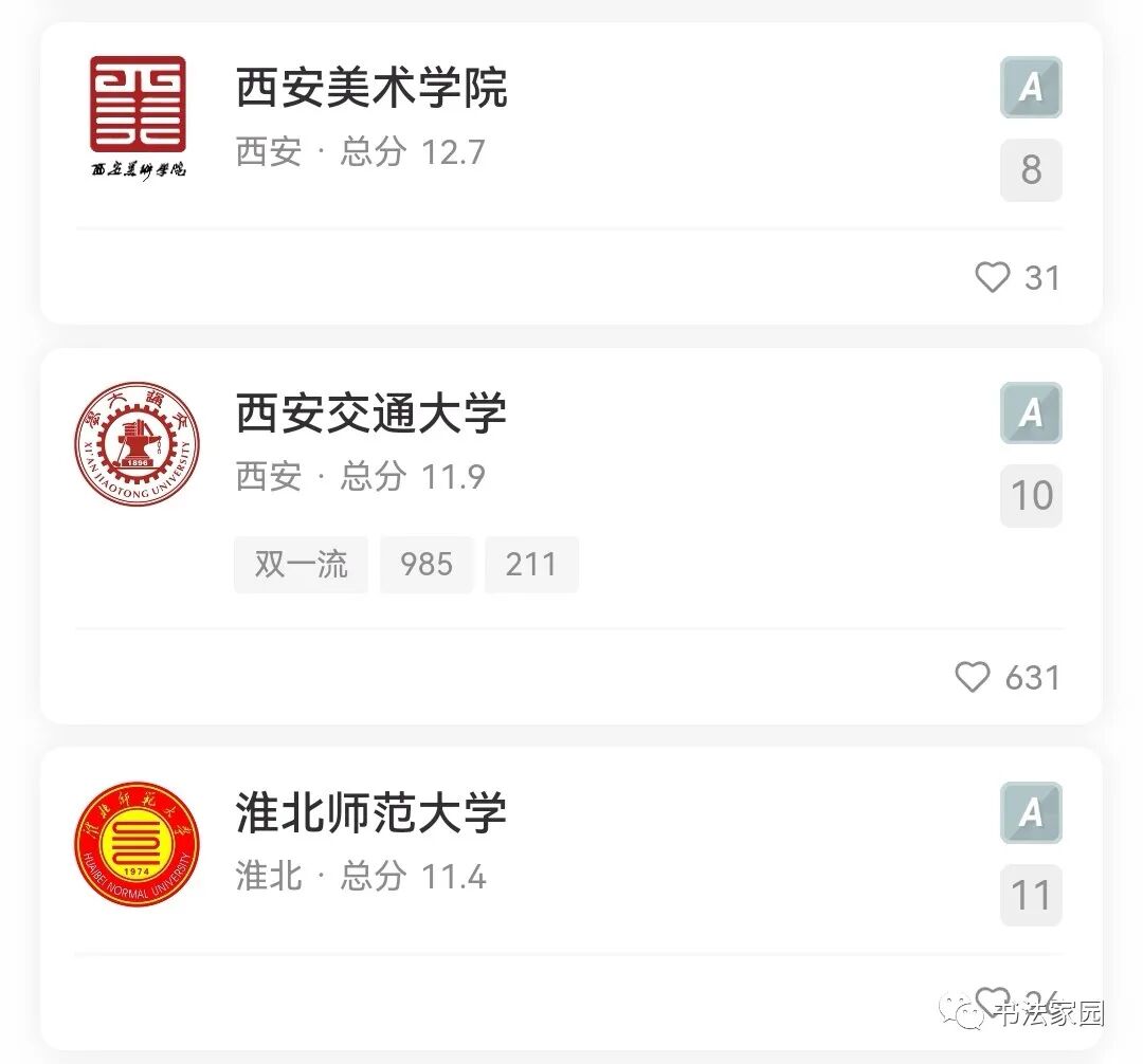 在书法学专业排名中,共有76所高校上榜。A+层次的高校依次为南京艺术学院、中央美术学院,总分均为17.3分,并列第一。