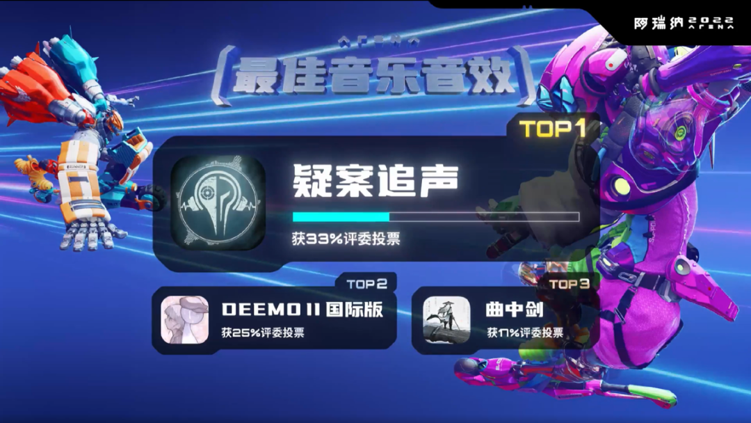 首先,《疑案追声》获得了今年的最佳音乐音效,比第二名《DEEMO Ⅱ》多了8%的票数。