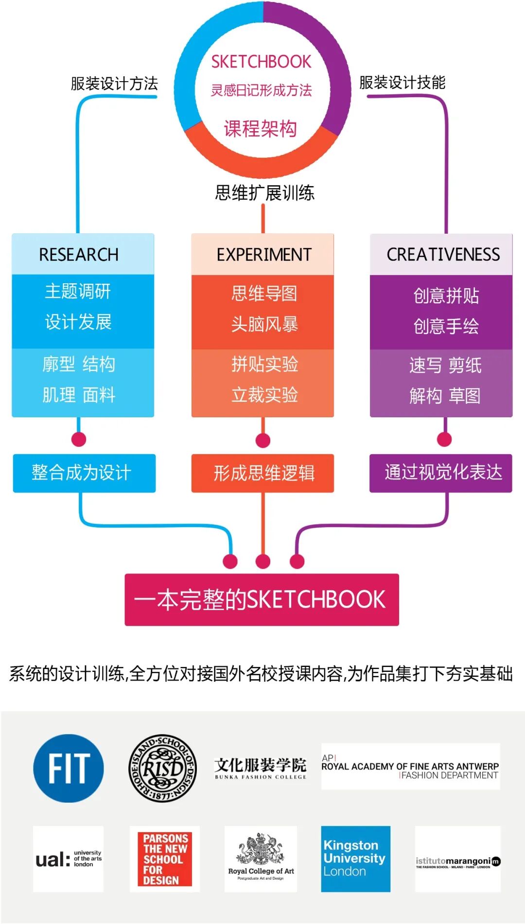 我们的课程将带给你西方最前沿的设计思维与理念,传授最先进的的服装设计方法。与国内的服装设计教育体系迥然不同的是,西方的服装设计体系特别看重中间过程——思维的发散、设计思路的发展,最终设计的形成与完善,而这些恰恰是国内的学生所欠缺的,我们的课程会彻底解决同学们在思维上的短板,紧密围绕西方的作品集要求,助你获得世界名校offer!