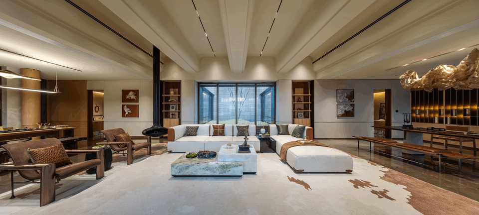 该项目的下叠地下室层高总计约10m,-1F、-2F的单层层高均超过4m,首层层高达到3.6m,这样一来,既消除了空间尺度上的局促感,还能让隐贵阶层的私域空间更开阔敞亮,完美诠释“院落奢居”的向往生活。