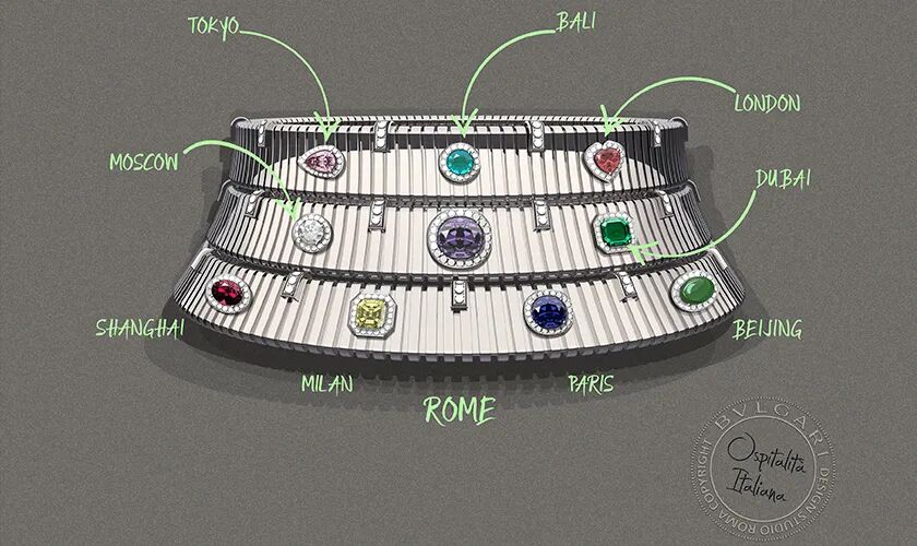 为庆祝宝格丽酒店和度假村再添新成员,秉承品牌诞生地罗马的宏伟壮丽元素,宝格丽还特别制作了一件纪念珠宝——“Bvlgari Ospitalità Italiana”项链,这是一款白色18K金Tubogas短项链,镶嵌了10种不同的珍贵宝石,各自对应着宝格丽酒店和度假村的豪华目的地。