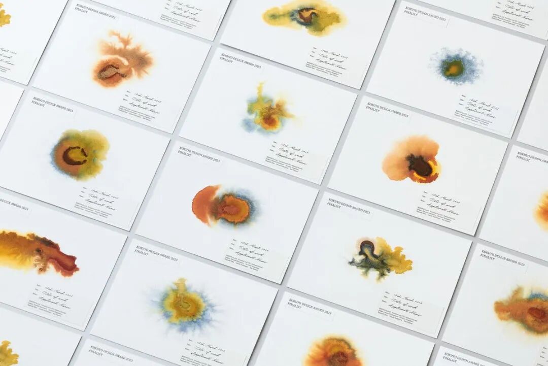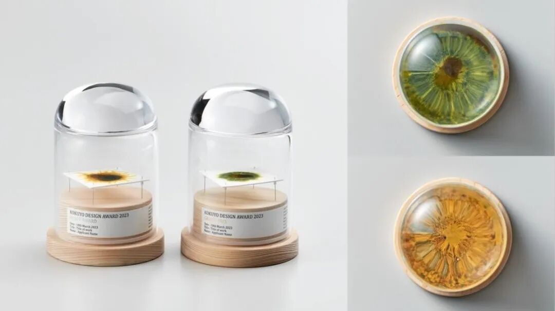除了出彩的获奖作品,本届的得奖奖状奖杯等设计也值得一看。奖状以植物染色的标本成像,置于画面中心,获奖者信息则参照名片式排版展开布局,表达各种事物混合后产生的混乱之美;奖杯以森林与泉水等多样的自然元素为视觉符号,制作成玻璃圆顶獎杯,并使用了主视觉的植物染色作品。