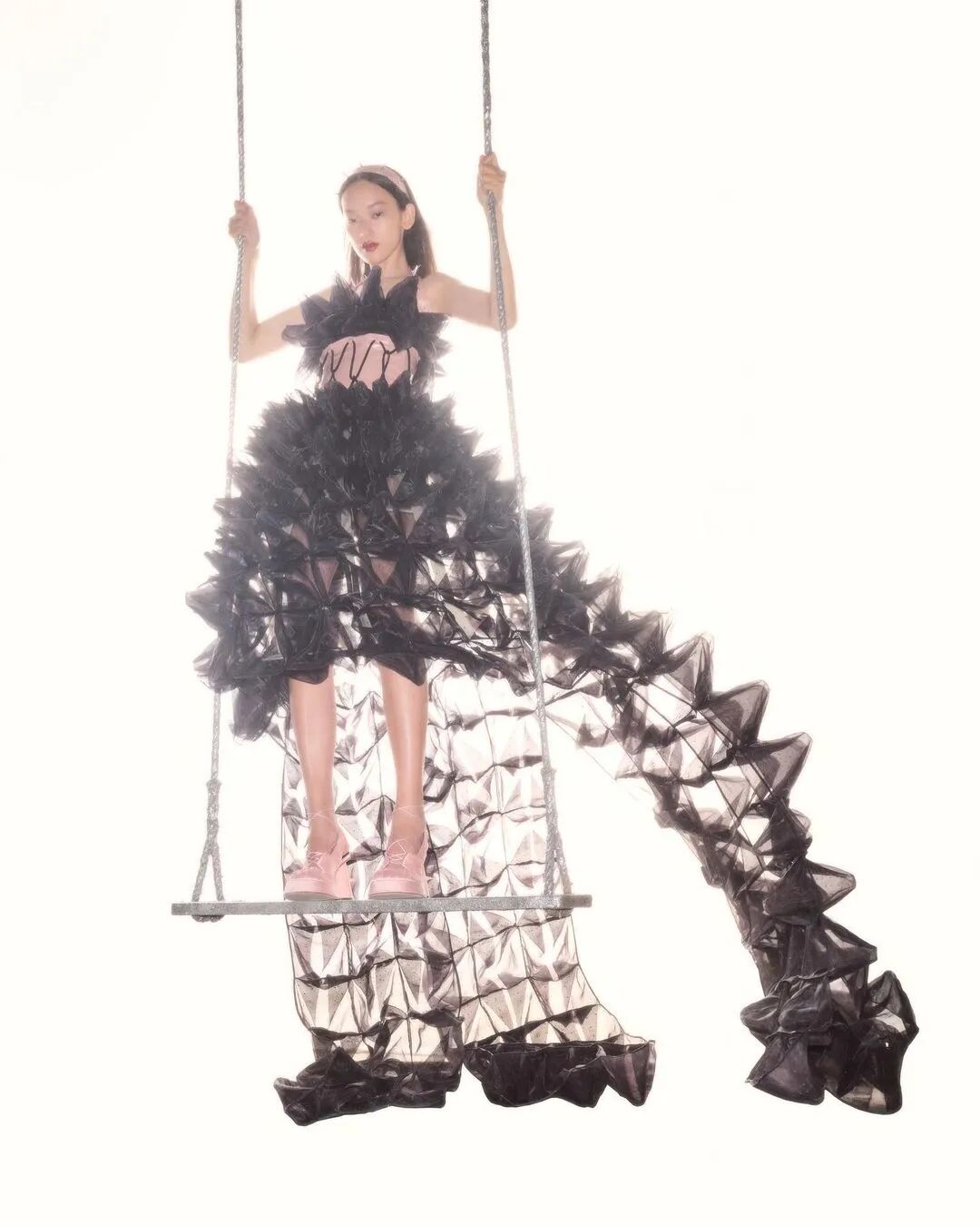 月幕之下,星光闪烁,一束昏暗的圆形灯光,像一轮幽亮的月亮。迷雾四起,在月光下的秋千上,模特身着轻柔的服装随着秋千飘荡,恰如人们的思绪在广袤黑夜中到处游走。