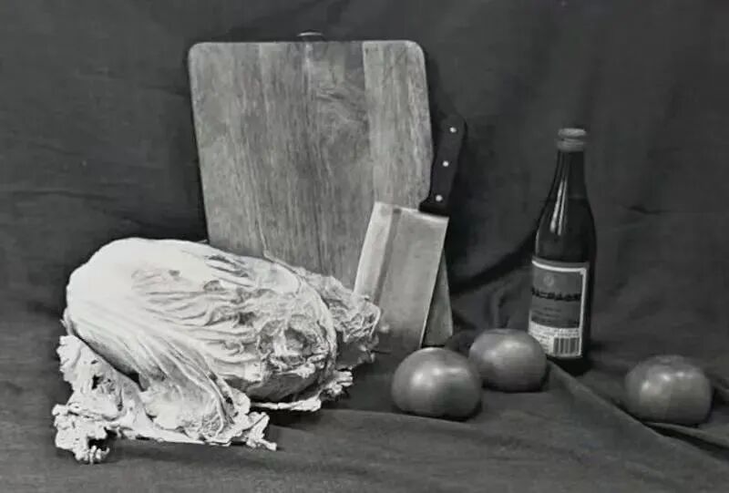 色彩考试是提供黑白照片,内容含砧板、菜刀、大白菜、二锅头白酒、西红柿三个、深灰色衬布一块。这些题材也是考生平时训练较多的内容,但构图不是很美观,要看考生是否能够反应过来,如果照抄构图,肯定不行。这组素材的画面里,白菜、菜刀、酒瓶、西红柿的质感都是很强的,表现有些难度。