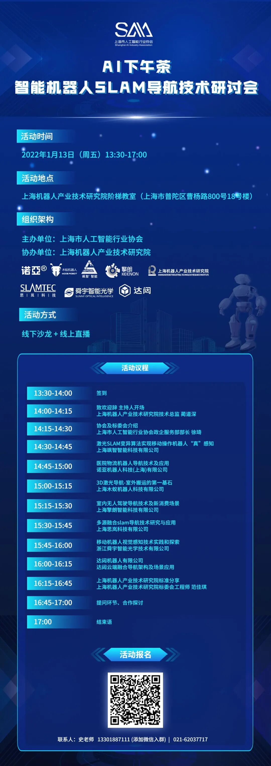 本次活动协会拟邀请7家涉及智能机器人SLAM导航系统的头部企业对相关技术在实际应用场景或遇到的技术壁垒进行分享,并拟邀请上海机器人产业技术研究院分享关于智能机器人SLAM导航技术的标准检测内容。