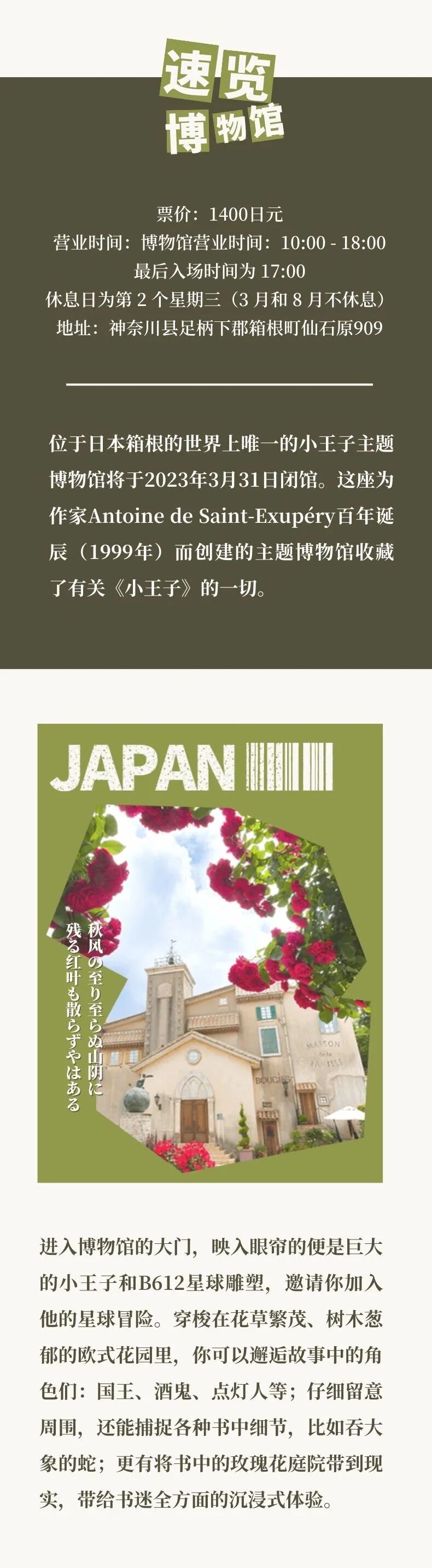 正发生2023-10-30 2023年1月日本博物馆 | 宫崎骏、八音盒… 你的青春回忆杀都在这里 本文来自微信公众号“赏游地STW”(ID:shaketowin)。大作社经授权转载,该文观点仅代表作者本人,大作社平台仅提供信息存储空间服务。 TAGS: 博物馆展览日本线下活动 相关文章2022年10月书法也有别…珠宝名表璀璨节日缤纷 | …MVRDV 受邀出席武汉大…黎晓亮:三个展 | 一场影…卡塔尔世界杯开幕式 土豪风…NFT行业周报:淘宝小程序…大师云集 • 献策狮城 |…【海外】《最后生还者2》制…2022年12月《综合艺术…索尼推出的首款汽车将成为“…