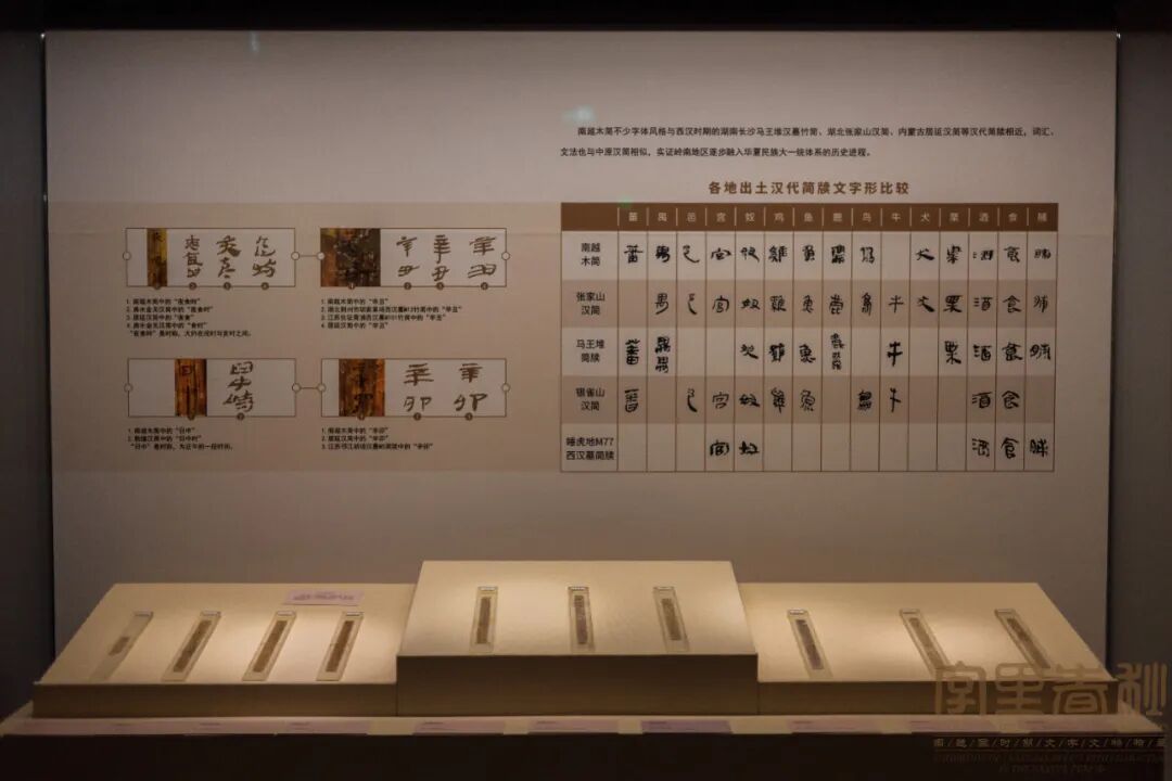 展览同时收集了西汉时期的长沙马王堆汉墓竹简、张家山汉简等汉代简牍照片与其作出比较,能看出南越木简的形态、词汇、文法都与中原汉简相似,实证岭南地区逐步融入华夏民族大一统体系的历史进程。