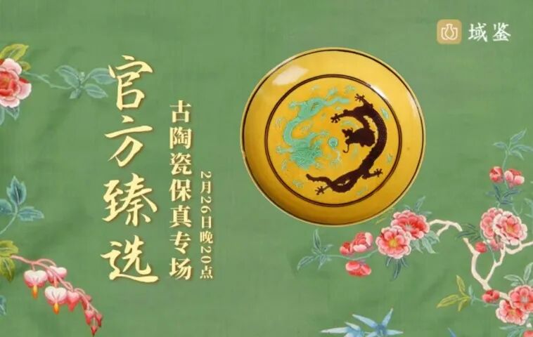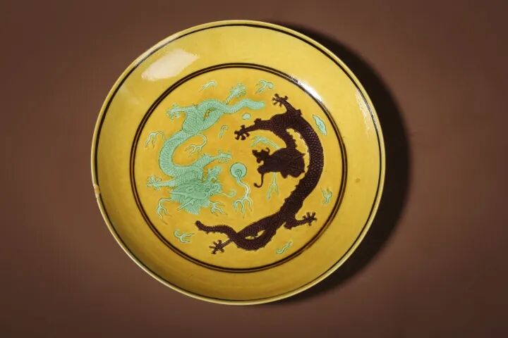 此件清同治·黄地赭绿彩双龙戏珠盘(官),款识;大清同治年制,敞口,弧壁,圈足。通体黄地素三彩装饰,外壁绘仙鹤卷云纹,盘心内饰赭色和绿色两条龙戏珠,龙纹气势恢宏,龙身鳞片清晰,鬃毛竖立。整体绘画细腻,填彩准确,色彩素雅,釉面莹润,为清同治官窑中的精品之作。