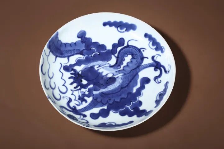 此件清中晚·青花过墙龙纹盘,敞口,弧腹,圈足,器身遍施白釉,釉色洁白胜雪,晶莹温润,青花着色,绘四爪龙纹,青花发色浓丽深艳,笔势大开大合,气魄逼人。青花龙身沿着口沿一直贯穿整器,宛如翻过高墙,表现出神龙见首不见尾的神秘感,恰似神龙从天而降,故而又称“过墙龙”。
