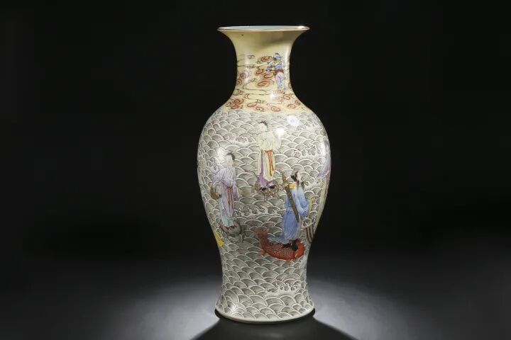此件民国·粉彩八仙过海图观音瓶,款识:乾隆年制,撇口束颈,丰肩鼓腹,束腰撇足,为标准的观音瓶形制,形制规整,比例协调,线条柔美,倍显端庄。内施松石绿彩,外壁以黄彩铺底,通景绘八仙过海纹饰,或骑驴踏鲤,或舞虾乘龙,其下为鳞鳞水波,与瓶颈的祥云相映成趣。此瓶祥云水纹画法逼真,八仙与异兽形神兼具,工艺超群,堪称佳作。