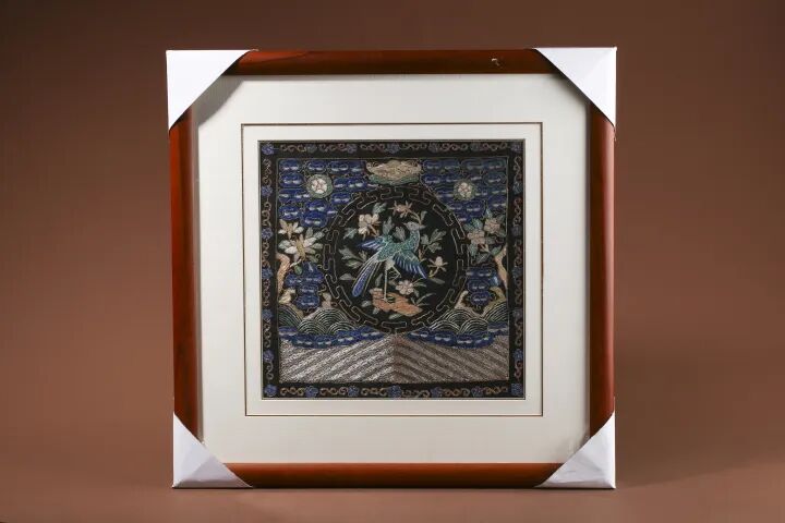 此件晚清民国·文官二品锦鸡补子绣屏,补面正中锦鸡展翅,四周装饰花卉纹,外圈加饰海水纹、云蝠纹、花卉纹。补面纹饰,均用金线钉出轮廓,复以针法填充内里,绣工平整细腻。整体工艺以盘金钉针为主,色彩丰富,绣工精细,更显华贵。
