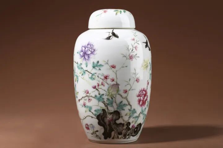 此件民国·粉彩洞石花鸟纹罐,款识:大清乾隆年制。直口短颈,长圆腹,圈足,器形端庄秀雅,质地坚实。器身施白釉,外壁以粉彩绘洞石花鸟纹,洞石钟灵毓秀,牡丹花开烂漫,枝叶舒卷繁茂,极具喜庆祥和之感。