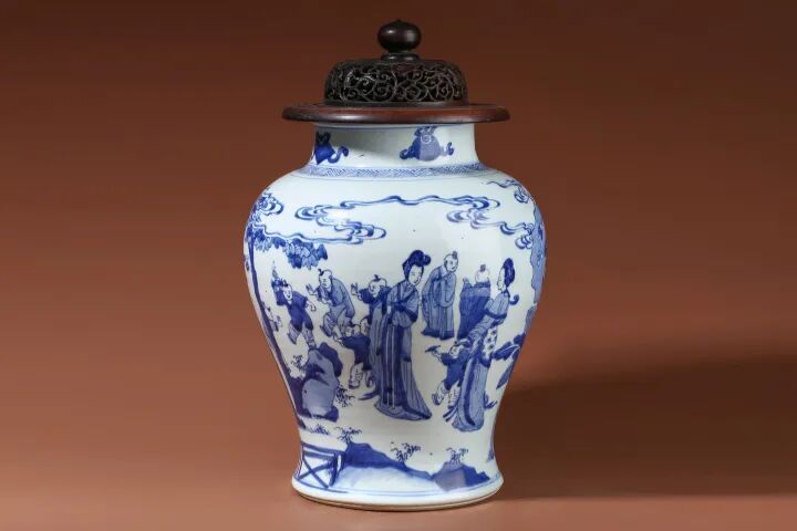 此件清康熙·青花四妃十六子图将军罐,直口短颈,丰肩,敛腹,圈足,器型敦雅饱满,釉色光润莹亮。外壁通以青花为饰,庭院幽静,洞石嶙峋,芭蕉葱茂,四妃或手拿花枝、或怀抱婴童,容貌娴静,十六名孩童三五成群,嬉闹玩耍,活泼灵动。整器画面布局有致,人物描绘生动,青花发色鲜艳明快,纹饰具有祈祝家国平安、多子多孙之美意,寓意吉祥。