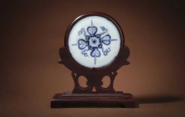 此件明空白期·青花十字金刚杵瓷板插屏,分为屏身与底座两部分,屏身呈圆形,瓷质,以上等红木包裹,置于底座之上,吻合严密而可旋转之,瓷表撷青花内绘四枚金刚宝杵作交叉排列成十字状,间结以飘带缀之,交结处中心为一饼图腾,有漩涡旋转之意。远观整器,制式四平八稳,古意盎然,适于文房陈设。