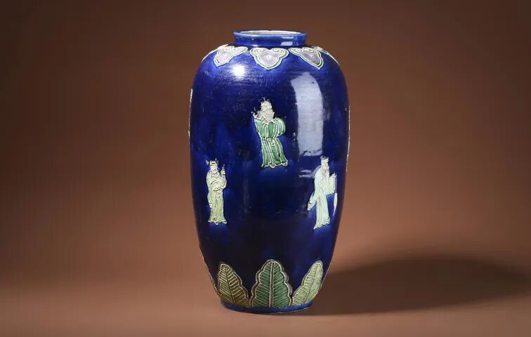 此件晚清民国·蓝地素三彩如意披肩八仙纹罐,撇口,束颈,长圆腹,圈足,胎体厚实。器身施蓝釉为地,上下圈饰如意纹和蕉叶纹,腹中圈饰八仙人物,人物动作自然,形神兼备,添饰工艺繁复,设色清丽多彩,观赏性佳,寓意吉祥。