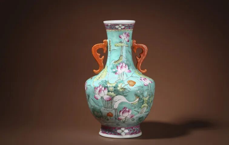 此件晚清民国·松石绿地粉彩一路莲科双耳尊,敞口,长颈,双耳,折肩,肩下渐收,圈足外撇,身施白釉,外壁绘松石绿地粉彩一路连科纹,荷花莹润饱满,亭亭玉立,碧荷舒卷如云,白鹭在叶间觅食,神态自然,构图简洁疏朗。鹭丝与莲花相配之图样,为「路」与「连」谐音,表示科举仕途顺利。古时科举时代士子为求功名,特别喜爱一路连科题材之装饰。