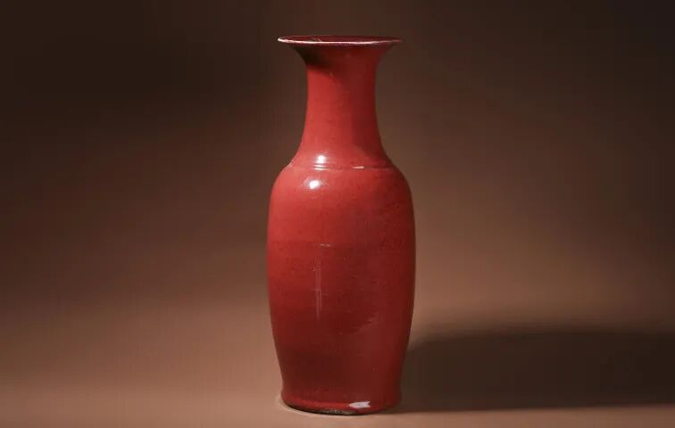 此件清晚·霁红釉玉壶春瓶,撇口,束颈,圆鼓腹,圈足,器型优雅别致,施窑变红釉,外壁釉色较为匀净,口内可见一周灯草白,釉质呈丝缕流动之感,细密冰纹绵亘瓶身,耐人寻味,极为美观。