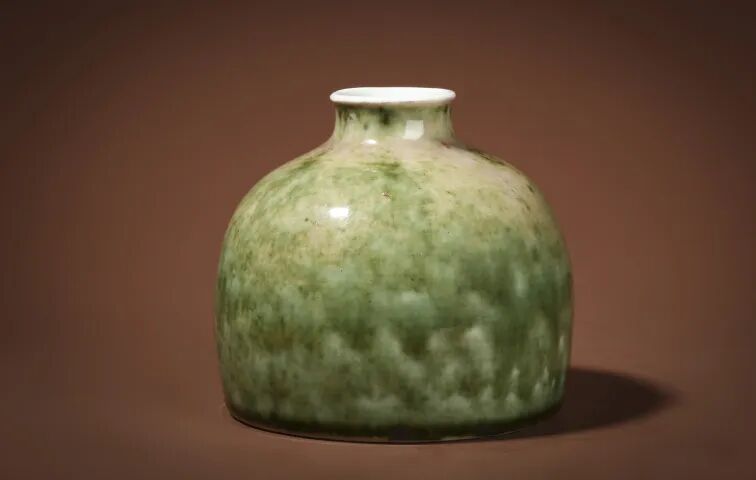 此件清晚·豇豆红釉太白尊,款识:大清康熙年制,小口外撇,溜肩,广底,浅圈足。器身外部通体施豇豆红釉,发色大面积呈浅绿色,自然莹润,散现斑点,颇具妙处。烧制呈绿色的豇豆红釉亦可称为苹果绿釉,上海博物馆藏“苹果绿釉印盒”与拍品釉色相近,可堪比较。