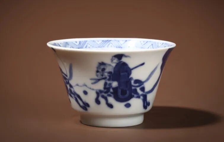 此件·青花岁寒三友纹杯,口微撇,弧腹,圈足,器型规整周正。胎质细腻,通体施白釉,碗外壁通景绘青花松竹梅「岁寒三友」花纹,青松坚忍不拔,枝干遒劲,修竹清逸俊秀,寒梅傲然盛放,妍芳雅致,将其各自特征表现得淋漓尽致。青花色泽淡雅,浓淡相宜,具晕染效果,与胎釉之莹白相互映衬。