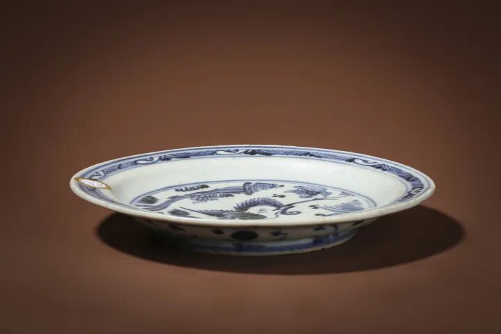 此件明弘治·青花松鹤延年纹折沿盘,侈口折沿,弧腹圈足,釉面青白,青花色泽蓝中泛灰黑。其纹饰布局疏朗,画风缓柔,盘心绘松鹤图,画面古松参天,傲然挺拔;灵鹤栖居,悠然自得,取“松鹤延年”之意。画面意境幽远,颇具清旷情趣。