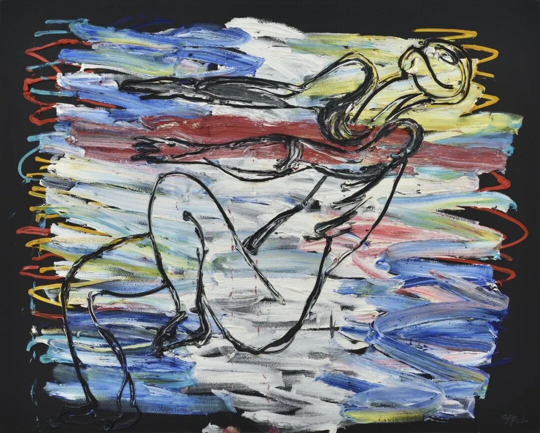 在本次群展中亮相的大型绘画作品《裸体人物》中,女性裸体的黑色轮廓从画布上厚重明亮的颜料和有力的笔触中浮现出来,暗示着原始能量的疯狂释放。阿佩尔称道,“我画裸体不是为了模仿自然,也不是为了尽可能接近自然。我用裸体作为创作一幅裸体画的灵感。因为我在五十年的绘画生涯中获得的所有自由——自由和技巧,色彩和设计——突然集中在一幅裸体画的形式中。每一个裸体都含有一种新的振动,和一种新的情感联想,这导致了每一幅裸体作品在颜色和形式都截然不同。“
