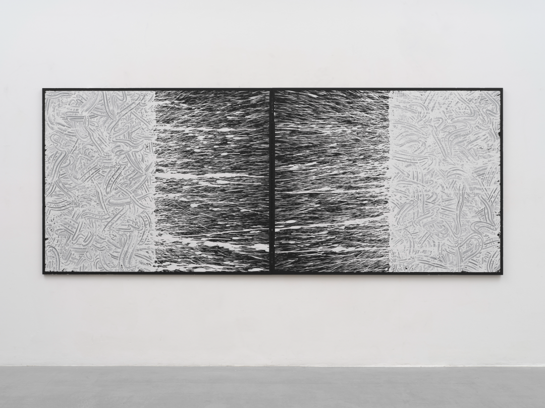 Richard Long, Untitled, 2023, China clay on aluminium with black gesso, 150.3 x 370 x 2.8 cm, 59 1/8 x 145 5/8 x 1 1/8 in © Richard Long. Courtesy Lisson Gallery