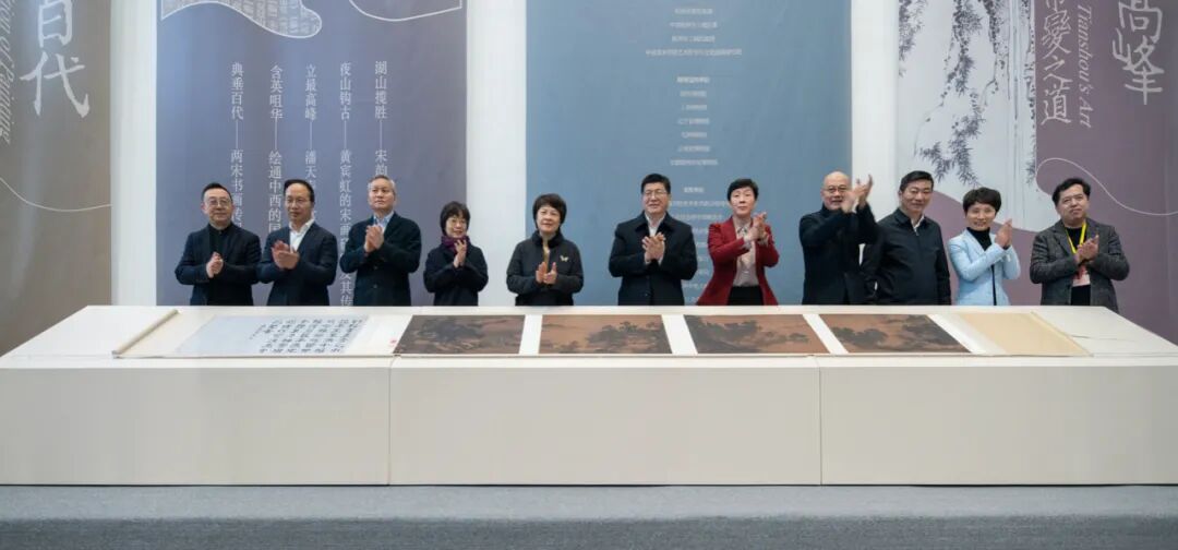 浙江省人大常委会副主任吴晶,浙江省政协副主席成岳冲,文化和旅游部科技教育司副司长刘冬妍,浙江省委宣传部副部长范庆瑜,浙江省教育厅党组书记、厅长毛宏芳,中国文联副主席、浙江省文联主席许江,杭州市委常委、宣传部部长黄海峰,中国美术学院党委书记金一斌,浙江省文旅厅副厅长、党组成员刁玉泉,浙江省文物局副局长夏丹荷作为开卷人,故宫博物院副院长王跃工作为持卷人,共同展开故宫博物院国宝级藏品《四景山水图》(复制件)的画卷,为展览启幕。