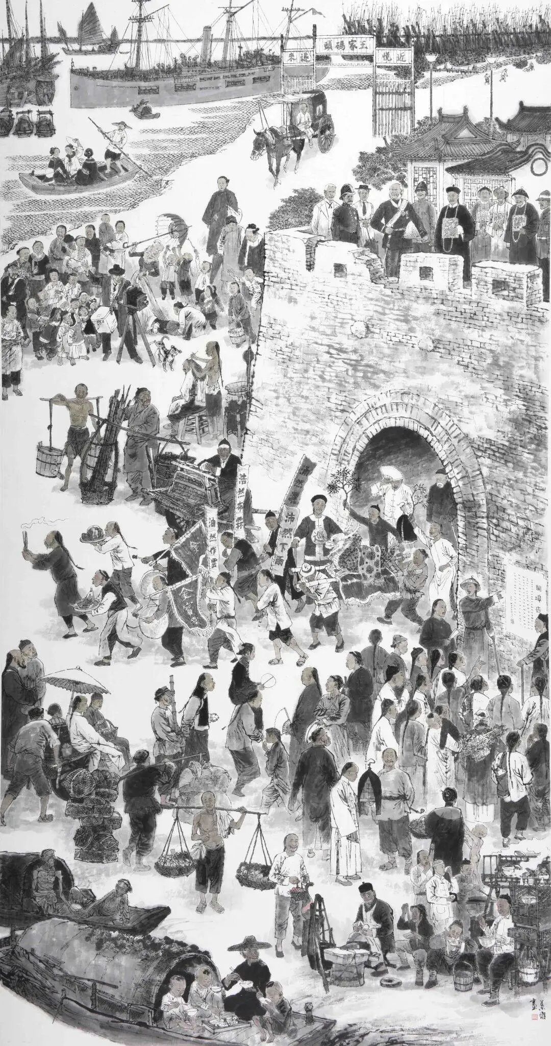 土山湾位于徐家汇南端,肇嘉浜在此拐弯,因疏浚河道,堆土成“山”而得名。奚文渊此次画《土山湾》,在作品画面处理上尤为精细。考虑到要表现的内容较多,画面驳杂,几经构思,最后确定用三联画的形式来予以表现。作品左右两联以线描为主,并以赭墨铺底,着意于营造出一种年代感;中间一联则以水墨为主,与左右两联形成技法上对比,给人以不同的质感。