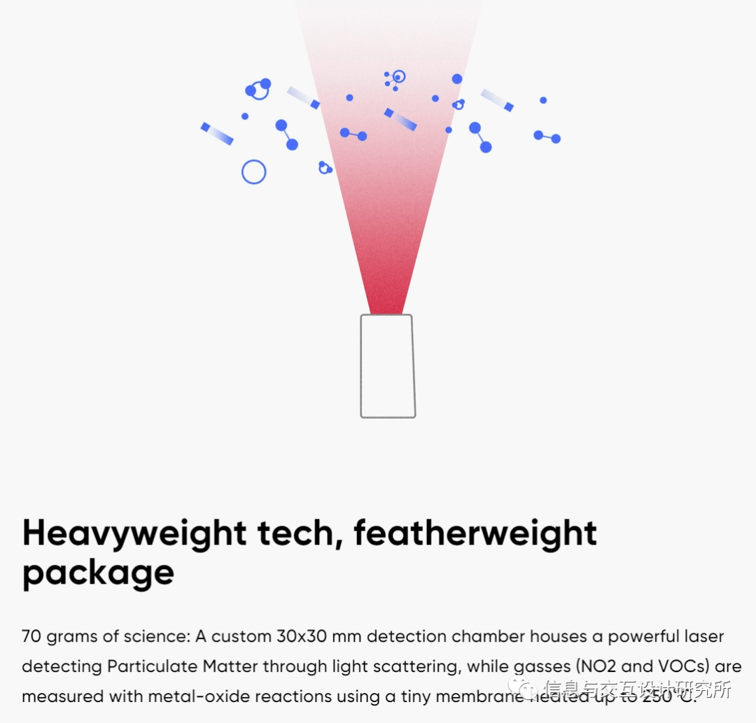 重量级科技,轻量级机身。70g的科学,定制的30x30 mm检测室装有强有效的激光,通过光散射检测颗粒物质,微型膜加热到250℃创造反应条件,气体(NO2和VOCs)循环通过,继而发生金属氧化反应,以期获得空气质量数据。