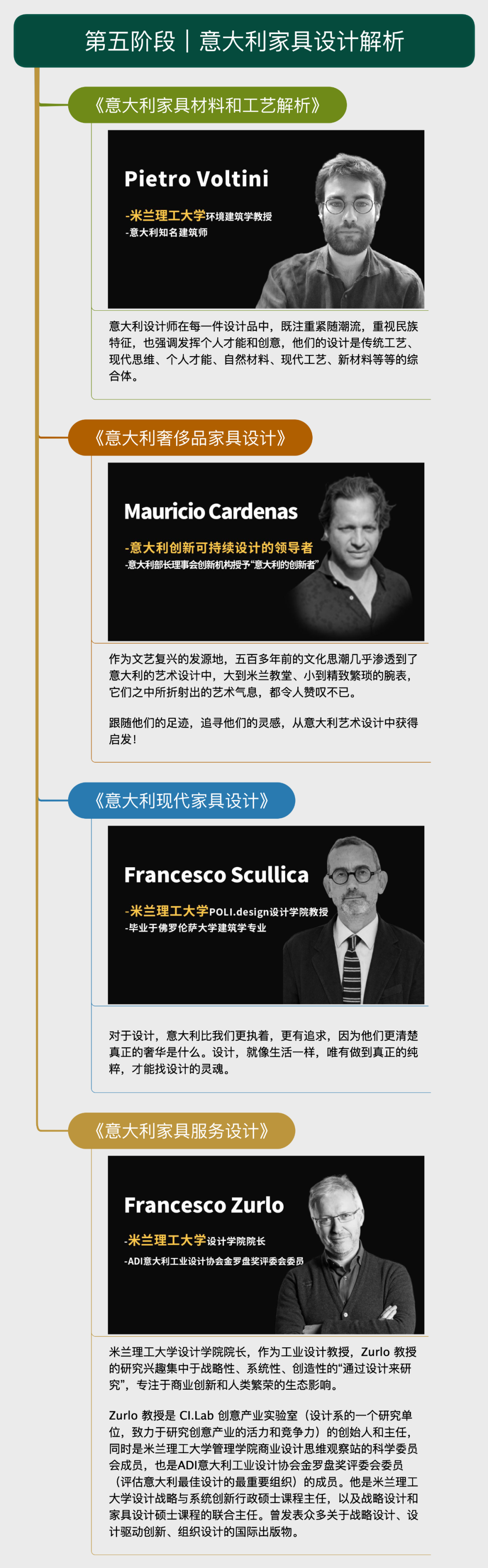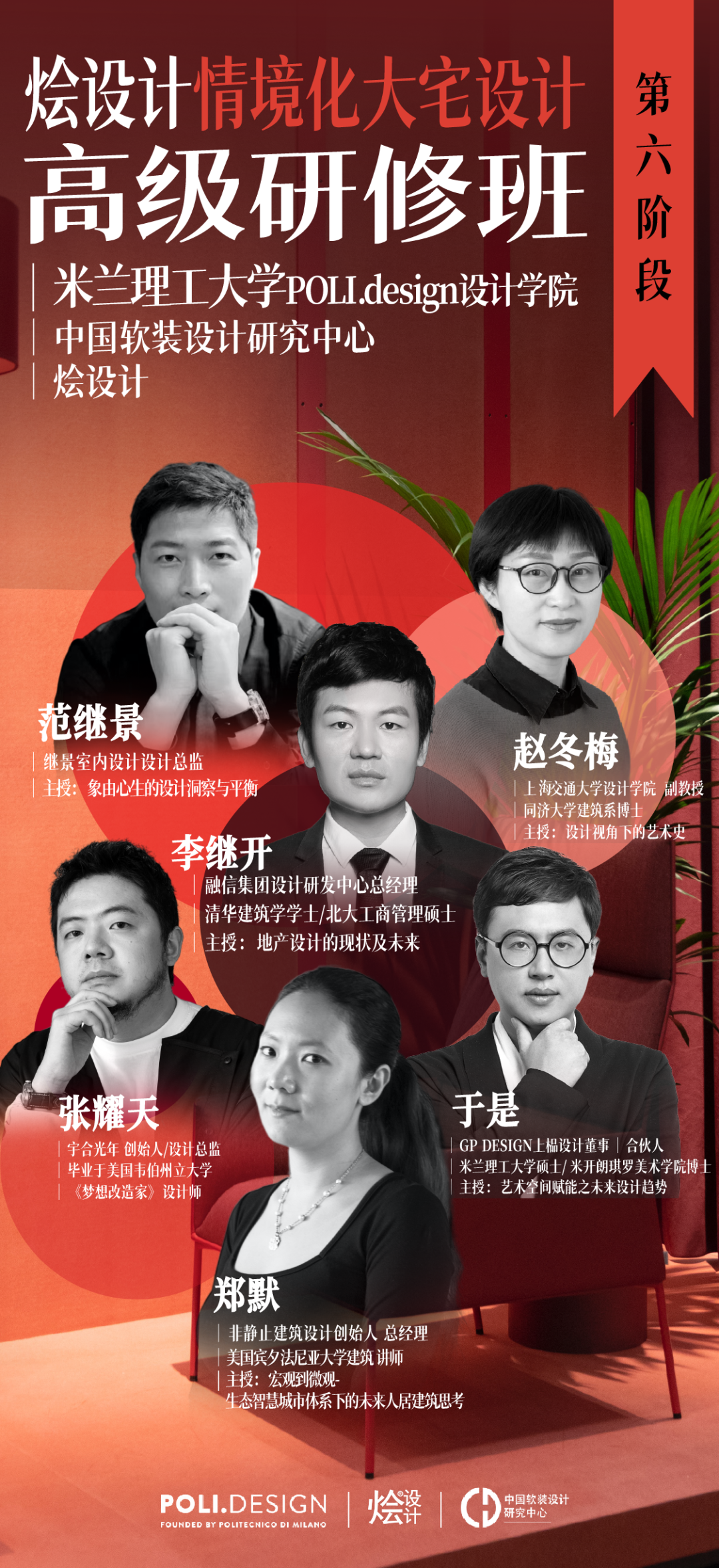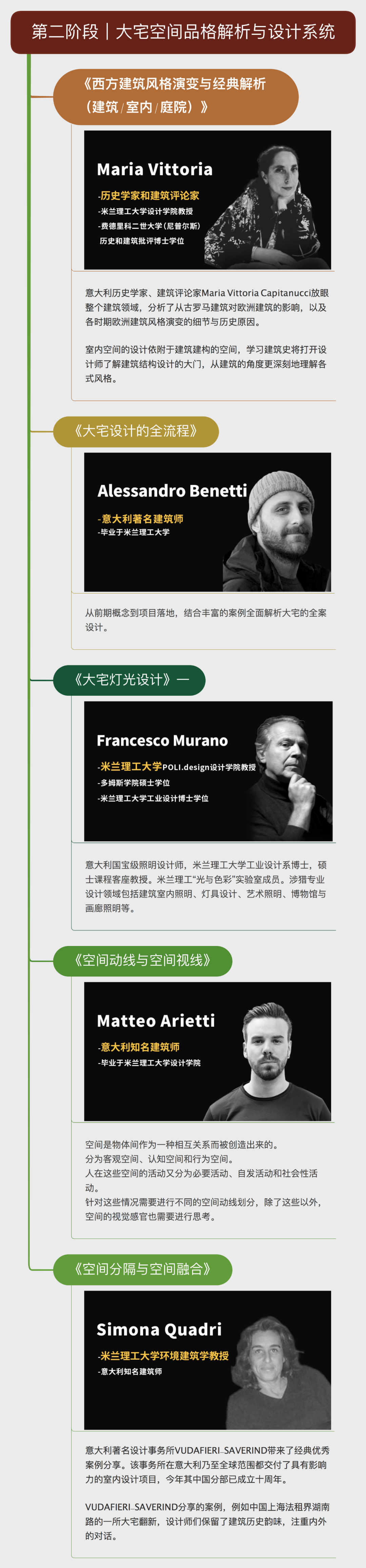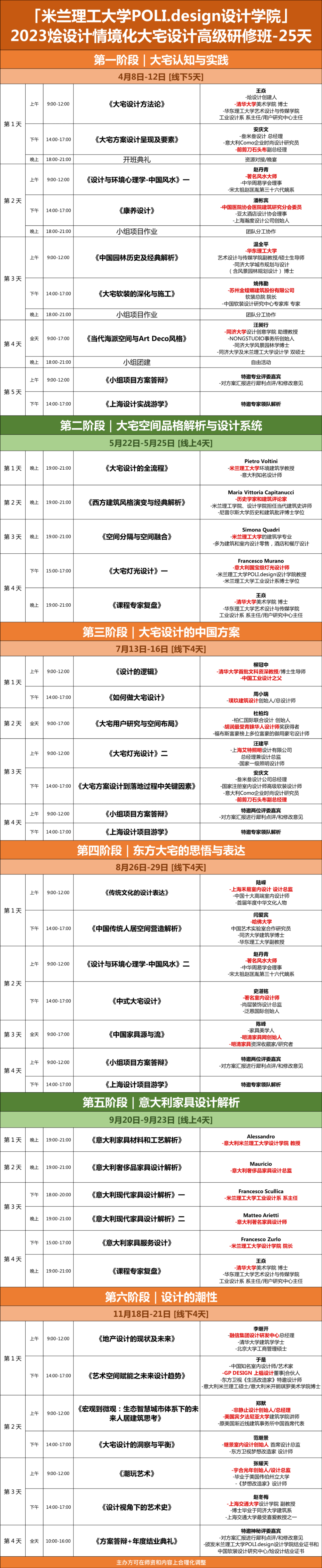 2023年《米兰理工大学POLI.design设计学院-烩设计情境化大宅设计高级研修班》共邀全球30多位顶级名师分别来自清华大学、哈佛大学中国艺术实验室、宾夕法尼亚大学、米兰理工大学、上海交通大学、同济大学、华东理工大学全球顶尖设计公司。深度梳理大宅设计的各方面知识,从硬装到软装,从设计方法论到设计实践,从中国到西方,从传统人居空间提升到设计的秩序、情感,各项核心技能。为设计师构建完整的知识结构,同时可以收获高含金量的名校证书