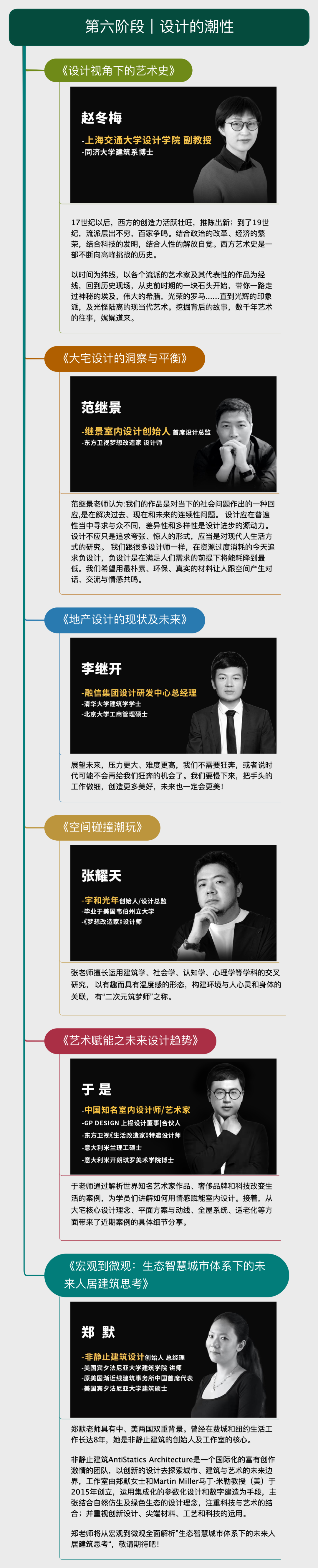 登门学古今,大宅知渊博。设计师一定要有主体性的认知,有高层次的思维,有世界性的视野,才可能在漩涡中不迷失自我,更好的解决当下的问题。此课程也不断在总结打磨、迭代升级。术业有专攻,1位老师不可能把不同领域,不同观念融会贯通,但是全球30多位各领域卓有建树的老师可以。