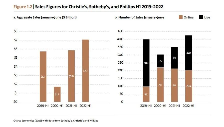 艺术市场在不同方面较2020年有所增长,被视为晴雨表的高端拍卖市场复苏最为显著,佳士得、苏富比、富艺斯全球总销售额与2021年同期相比,2022年上半年的销售额增长了20%,也高于2019年上半年(增长了7%)。