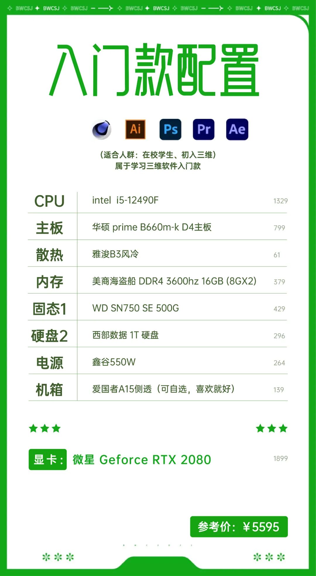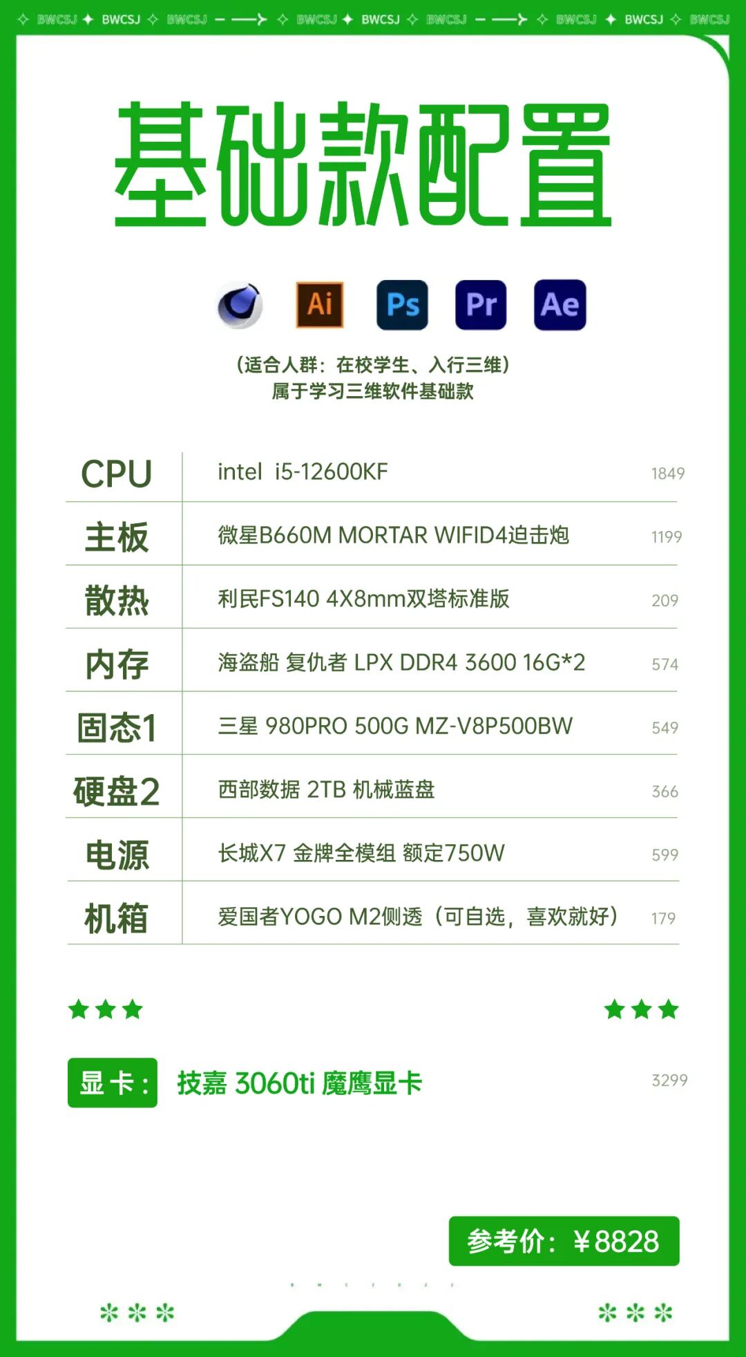 配置仅供参考,并不是绝对的,可以根据自己的需求更换,如果你有剪辑需求比较多的话,可以适当把CPU拉高一点~