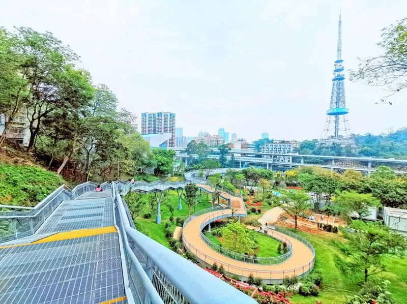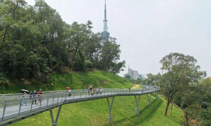 “云端漫步,还绿之道”,广州架空的步行道“云道”串联起白云山、云台花园、麓湖公园、雕塑公园、越秀公园、中山纪念堂等城市花园,一路鸟语花香。“云道”将低效的城市灰空间转化为全民共享的积极空间,使老城区焕发出新活力,实现“青山全入城”。