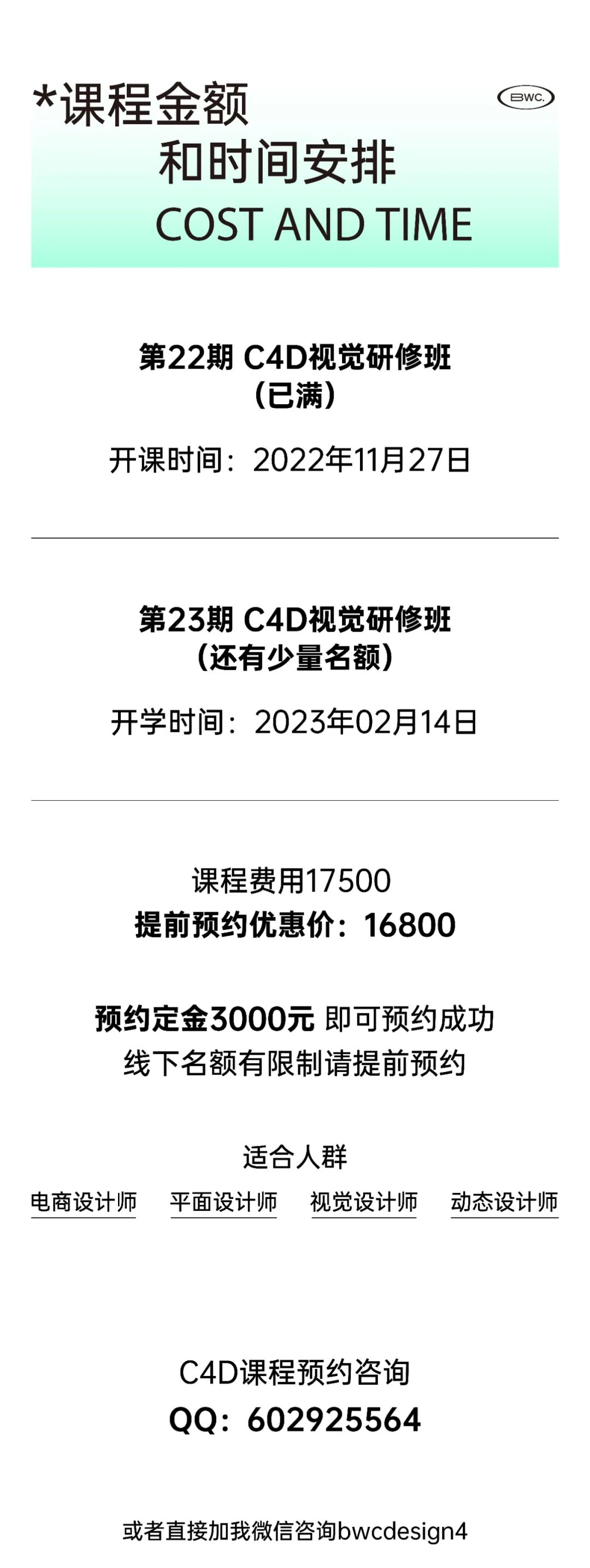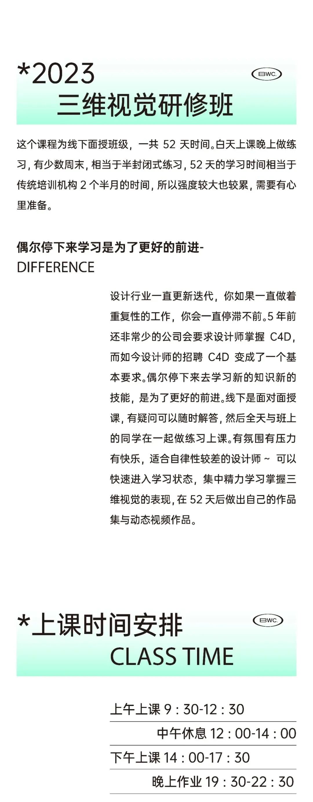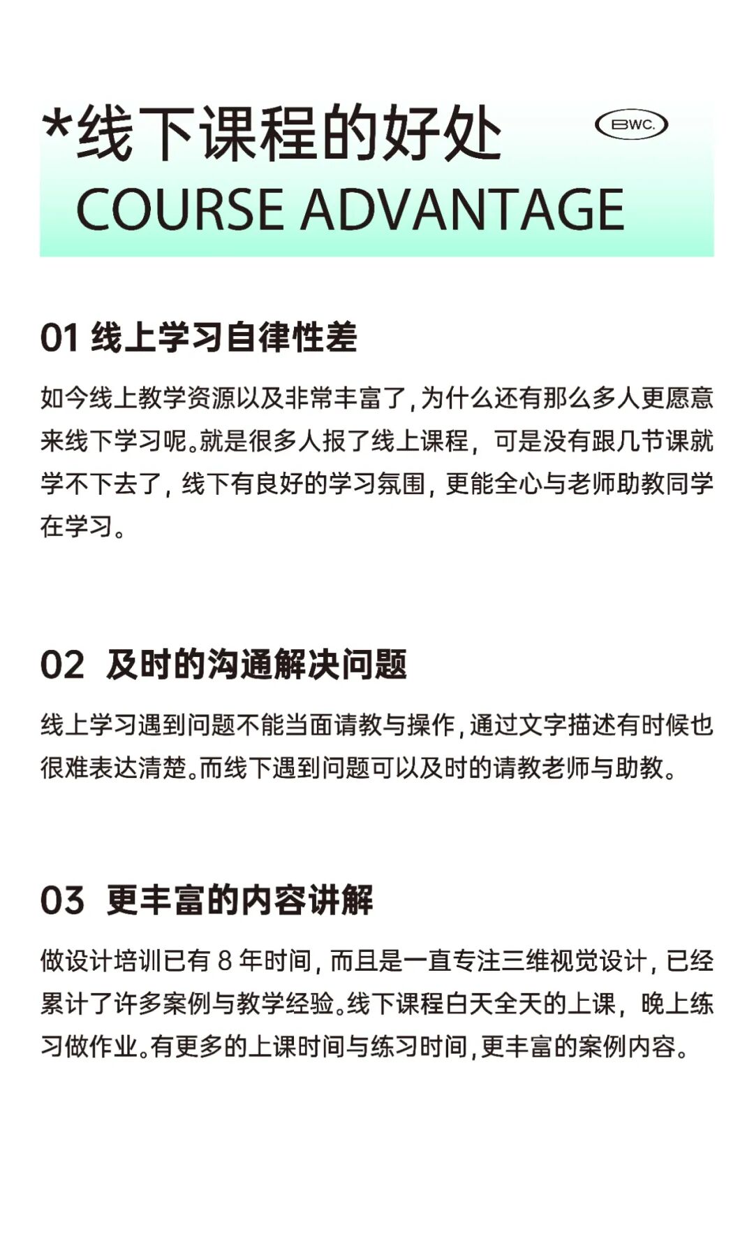 设计行业一直更新迭代,你如果一直做着重复性的工作,你会一直停滞不前。5年前还非常少的公司会要求设计师掌握C4D,而如今设计师的招聘C4D变成了一个基本要求。偶尔停下来去学习新的知识新的技能,是为了更好的前进。线下是面对面授课,有疑问可以随时解答,然后全天与班上的同学在一起做练习上课。有氛围有压力有快乐,适合自律性较差的设计师~ 可以快速进入学习状态,集中精力学习掌握三维视觉的表现,在52天后做出自己的作品集与动态视频作品。