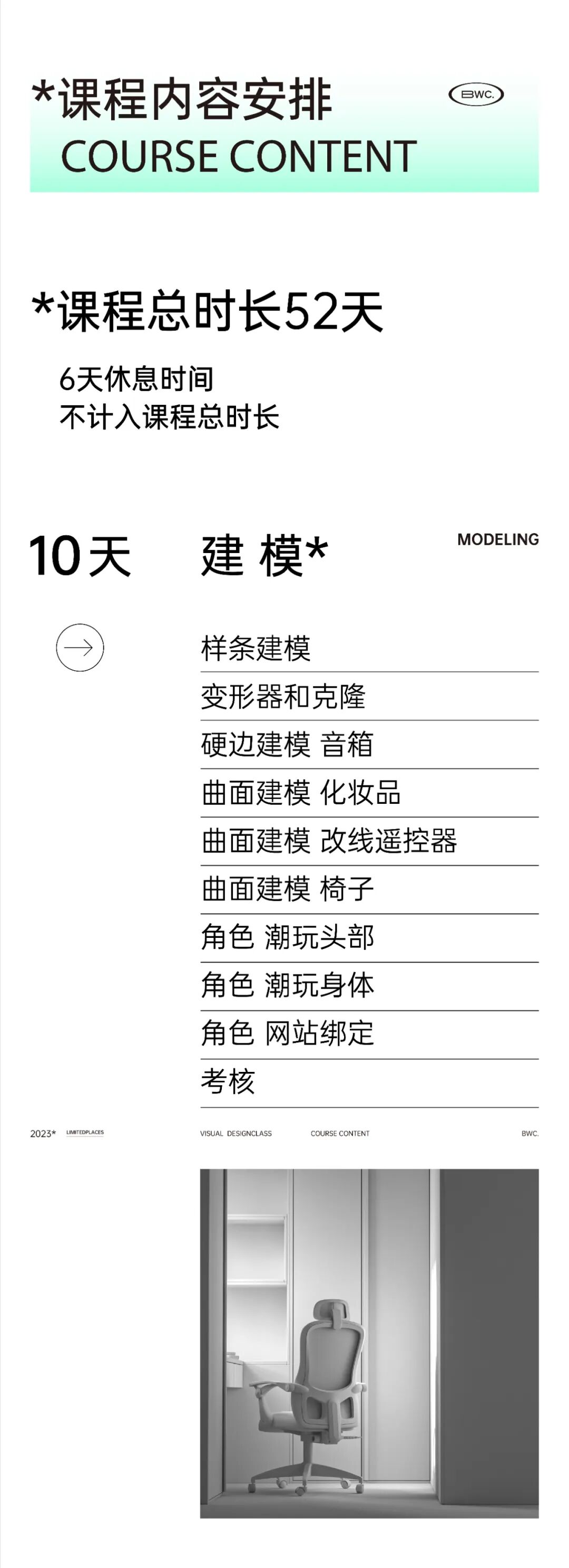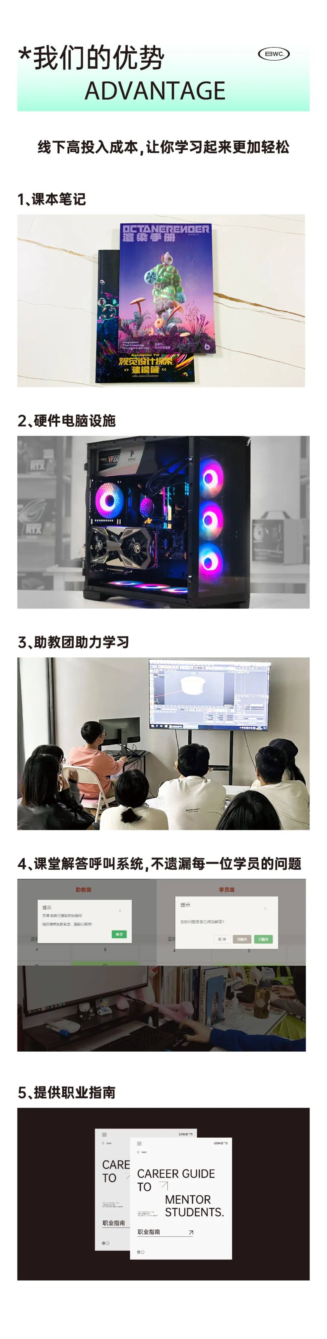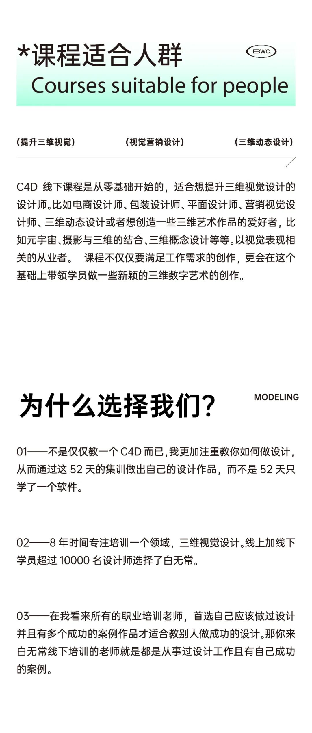 设计行业一直更新迭代,你如果一直做着重复性的工作,你会一直停滞不前。5年前还非常少的公司会要求设计师掌握C4D,而如今设计师的招聘C4D变成了一个基本要求。偶尔停下来去学习新的知识新的技能,是为了更好的前进。线下是面对面授课,有疑问可以随时解答,然后全天与班上的同学在一起做练习上课。有氛围有压力有快乐,适合自律性较差的设计师~ 可以快速进入学习状态,集中精力学习掌握三维视觉的表现,在52天后做出自己的作品集与动态视频作品。