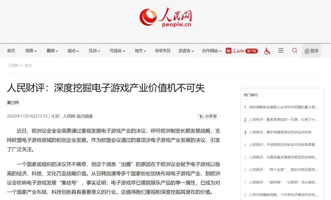 昨日,人民财评发布了一篇名为《深度挖掘电子游戏产业价值机不可失》的文章,引发游戏行业从业者的大量转发。里面强调“电子游戏早已摆脱娱乐产品的单一属性,已成为对一个国家产业布局、科技创新具有重要意义的行业。这值得我们重视和深度挖掘其潜在的价值。”
