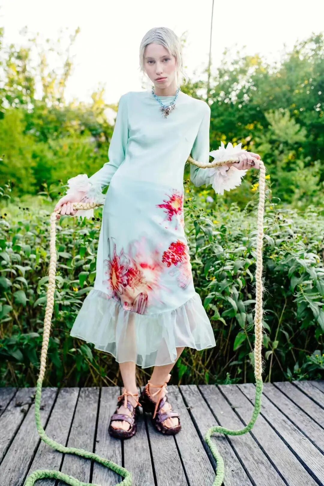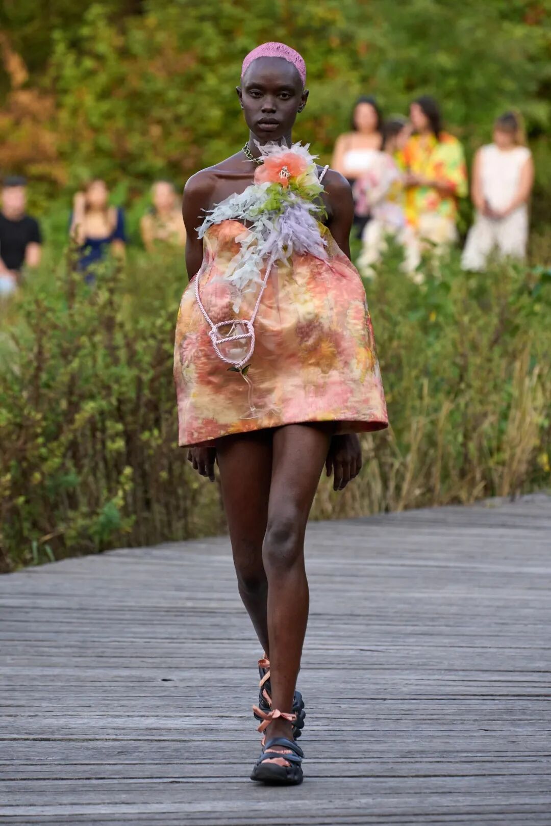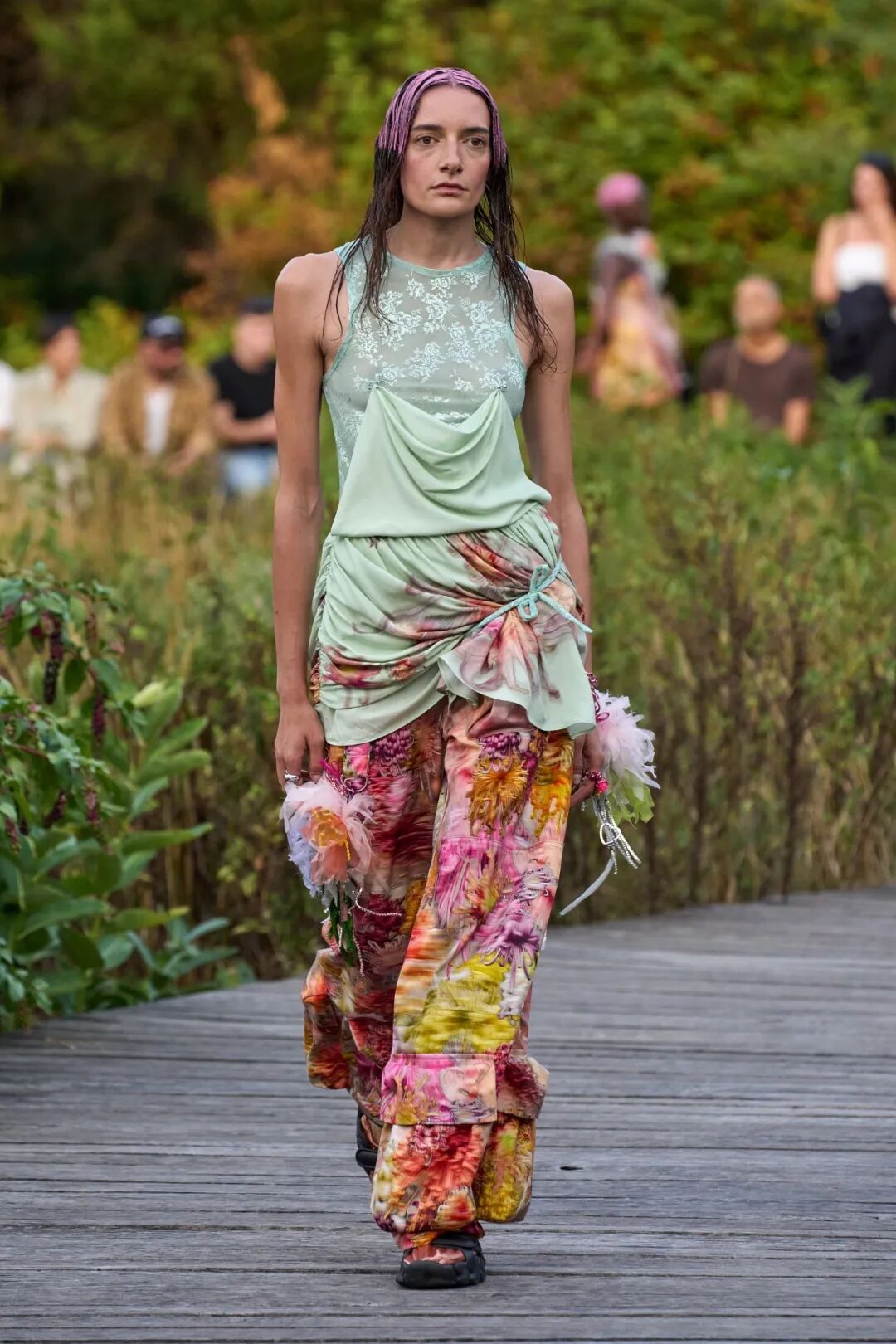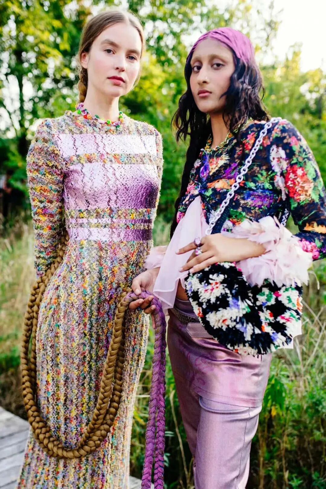 2023春夏系列,设计师天马行空的色彩与混搭装扮达成统一,模特用拖地长辫诠释着自己的鲜明个性,手绘绘印花和雪纺丝制成的花朵装饰,以及西兰花制成的手袋也都格外引人注目,也在另一方面体现了品牌一直以来的可持续性理念。