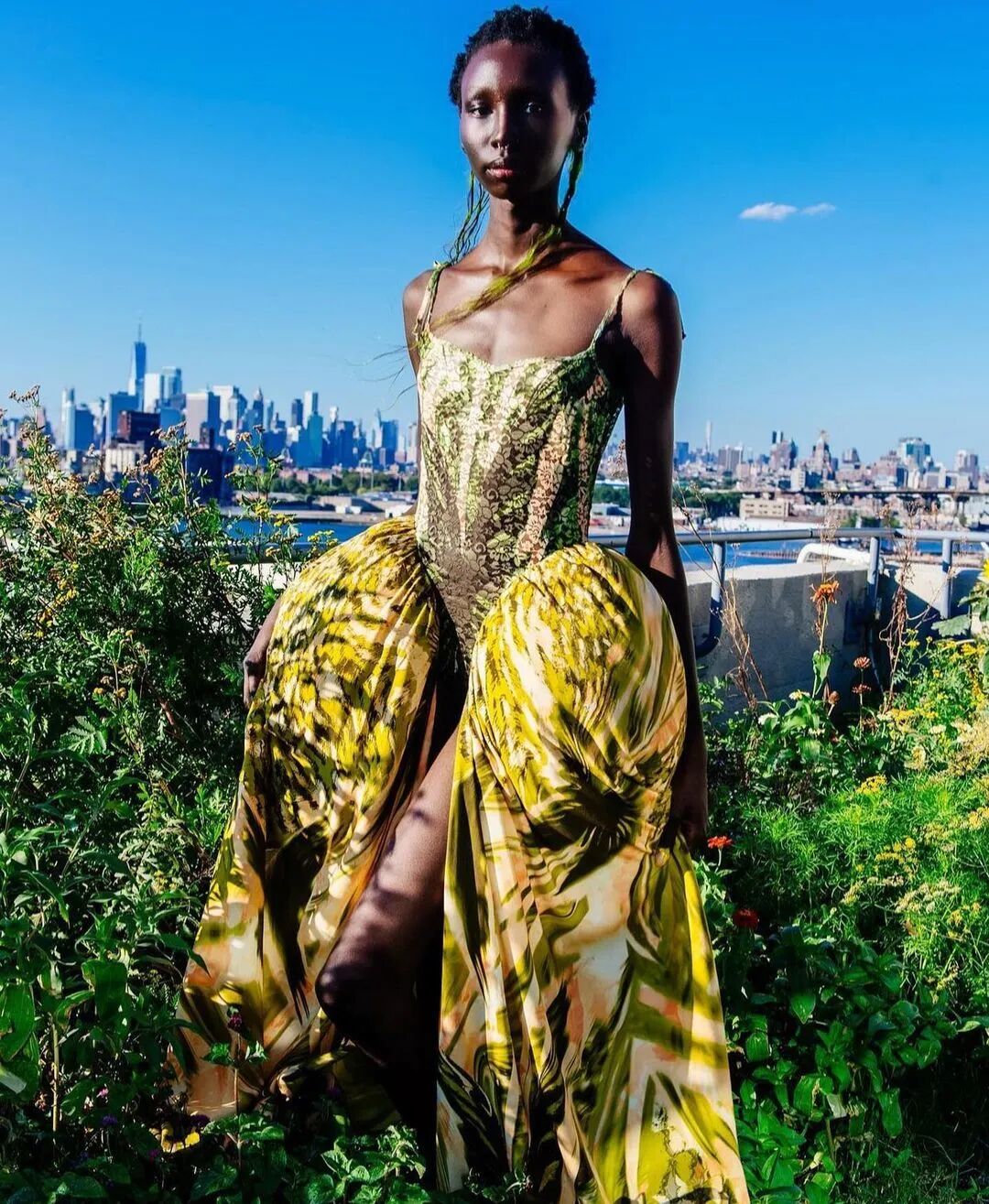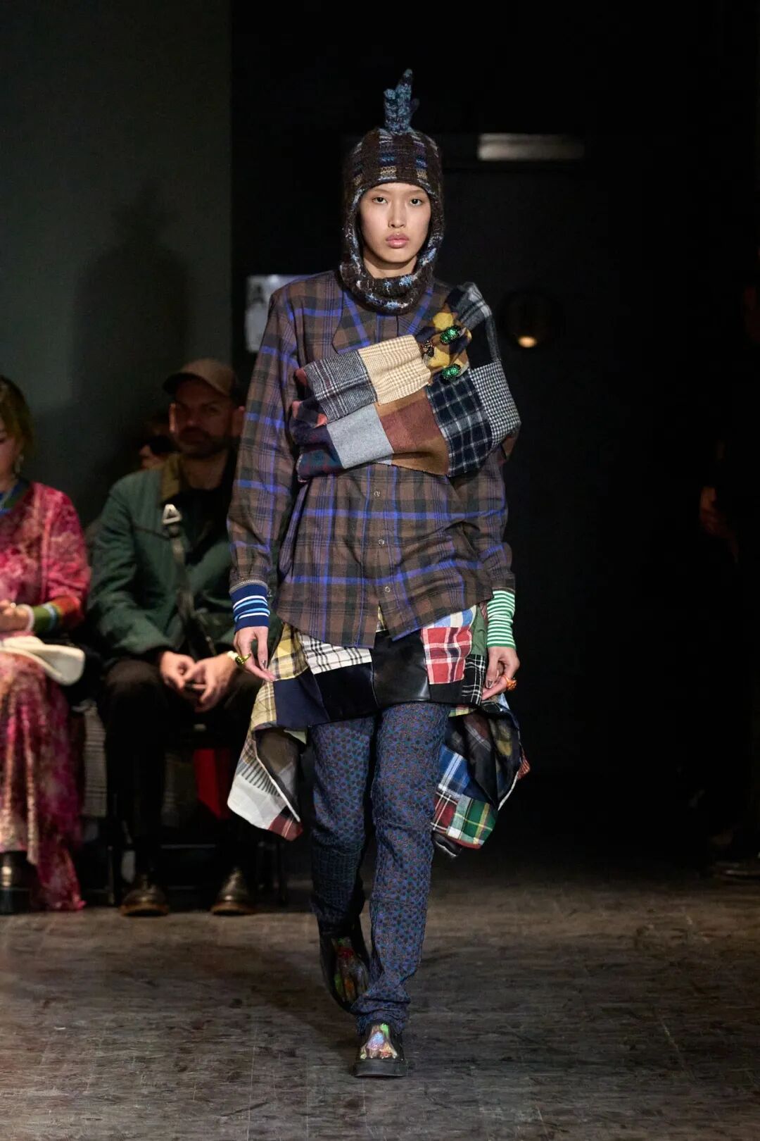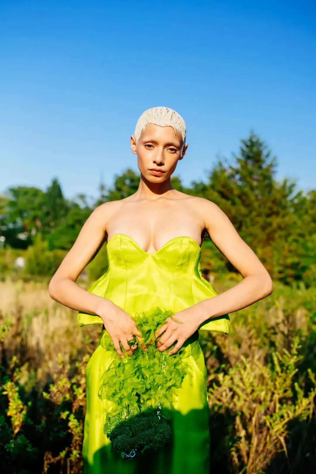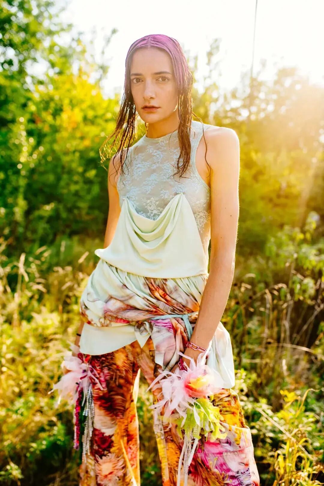2023春夏系列,设计师天马行空的色彩与混搭装扮达成统一,模特用拖地长辫诠释着自己的鲜明个性,手绘绘印花和雪纺丝制成的花朵装饰,以及西兰花制成的手袋也都格外引人注目,也在另一方面体现了品牌一直以来的可持续性理念。