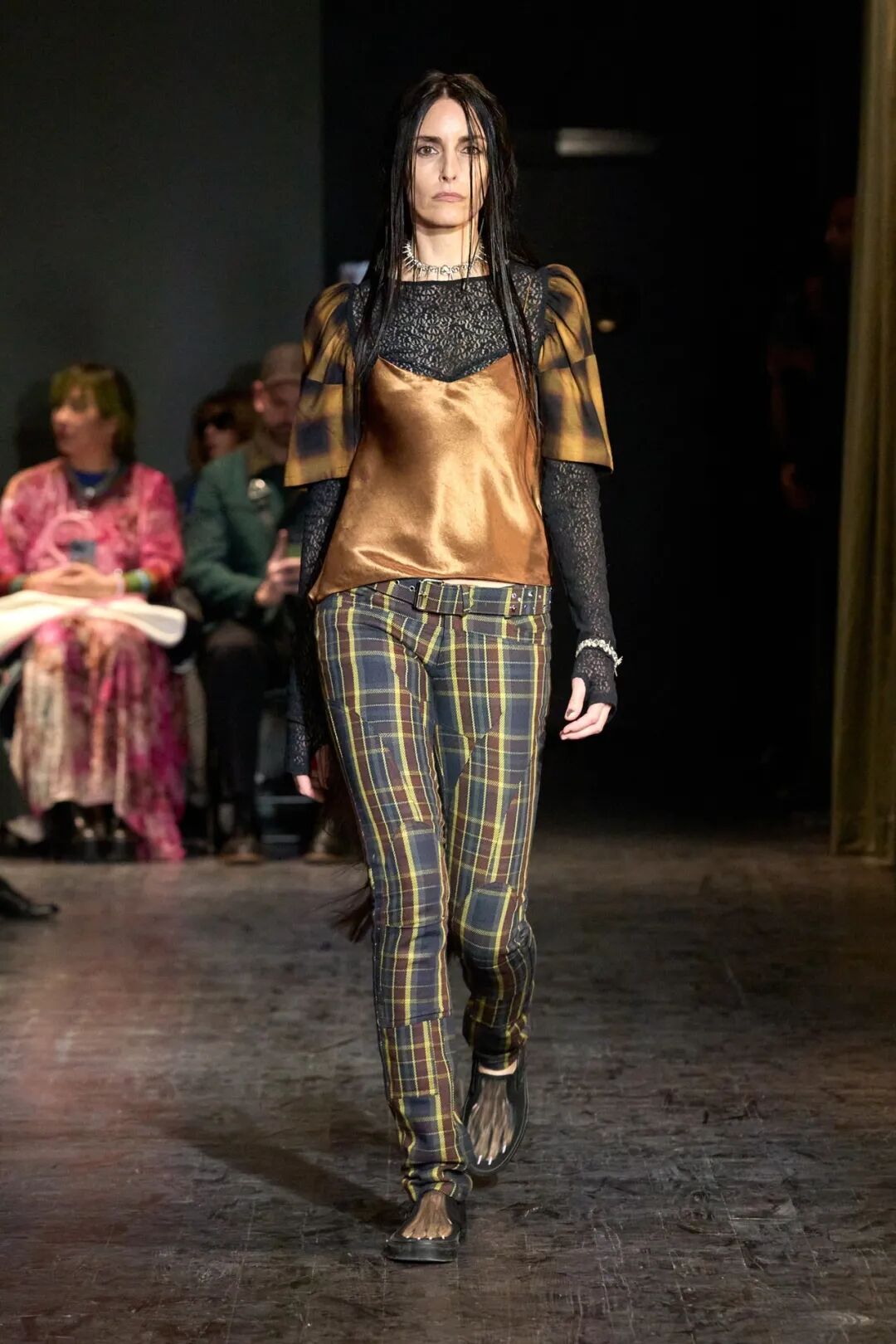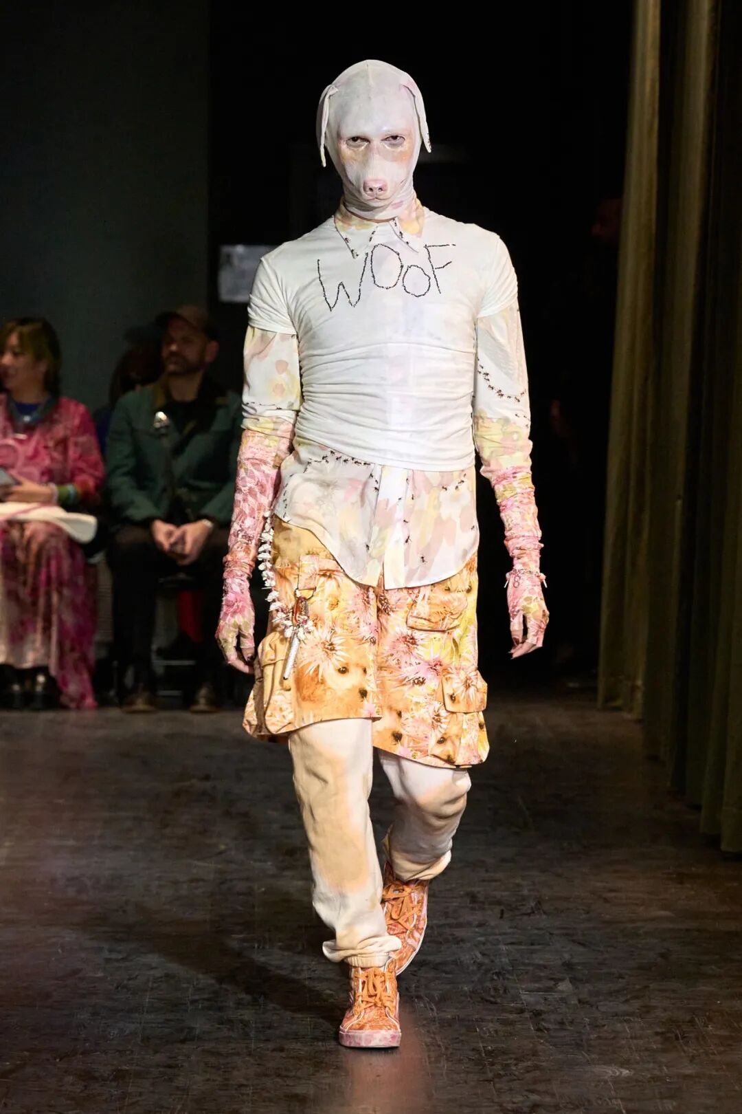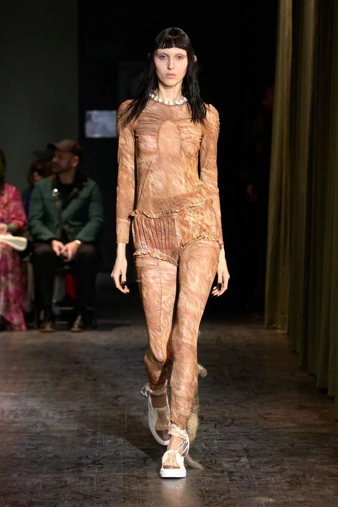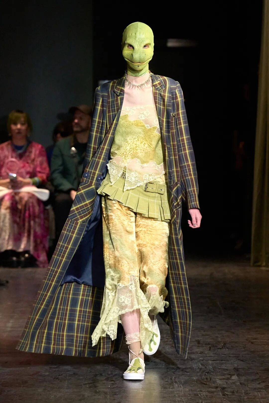设计师对动物图案的运用非常直白,与复杂的层次感形成了对比,她将图案印在服装上,毛皮印花牛仔露肩连衣裙,搭配早前秀场之一的阔腿工装裤。精致的蕾丝边饰可生物降解缎面背心是美丽的绿色阴影,仔细观察是爬行动物壁虎皮肤印花,搭配绝妙的滞销格子羊毛大衣。就连 Taymour 的狗 Pow 也客串了一把,它的脸被印在了一件 T 恤上,穿这身衣服的模特把它抱在胳膊下。