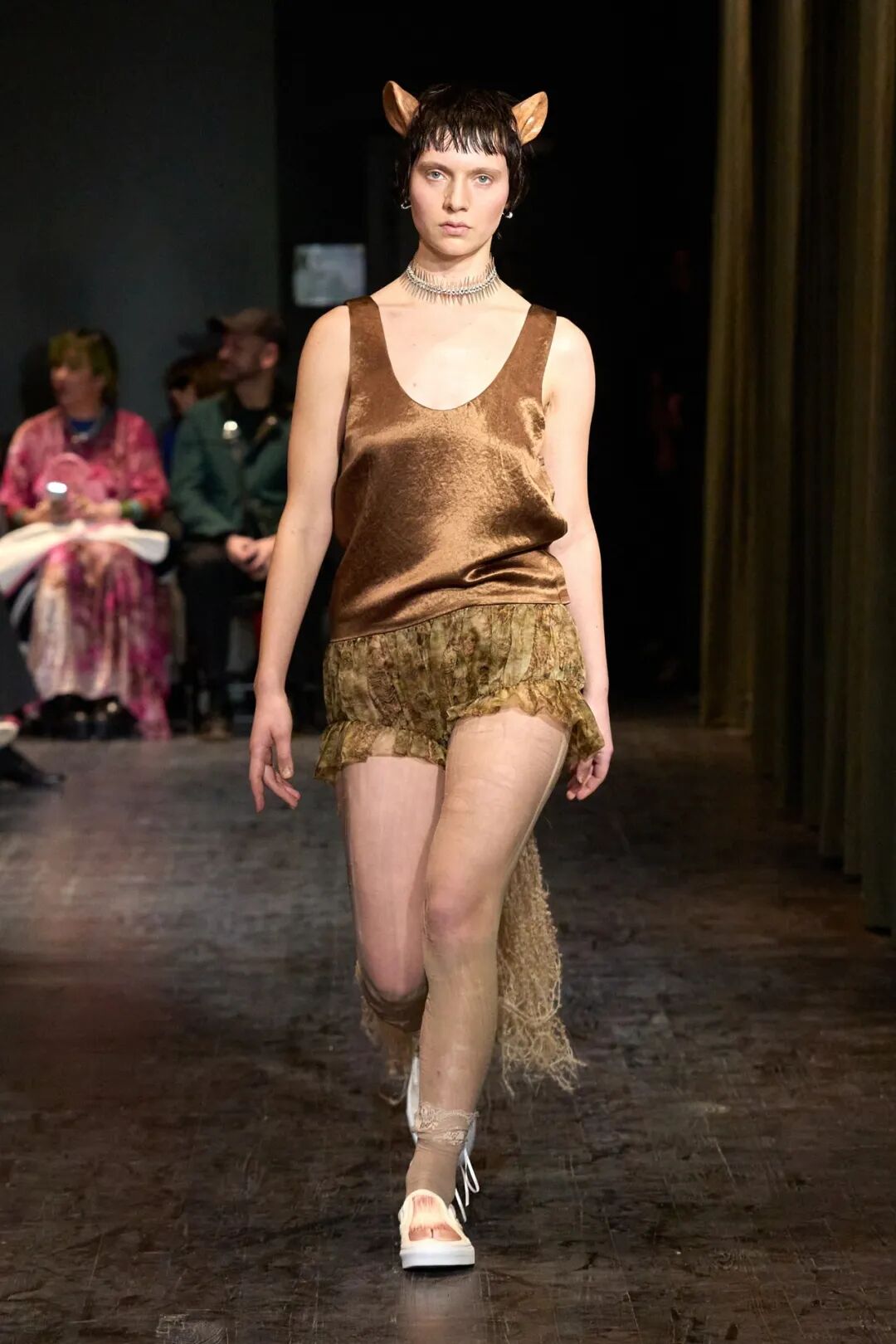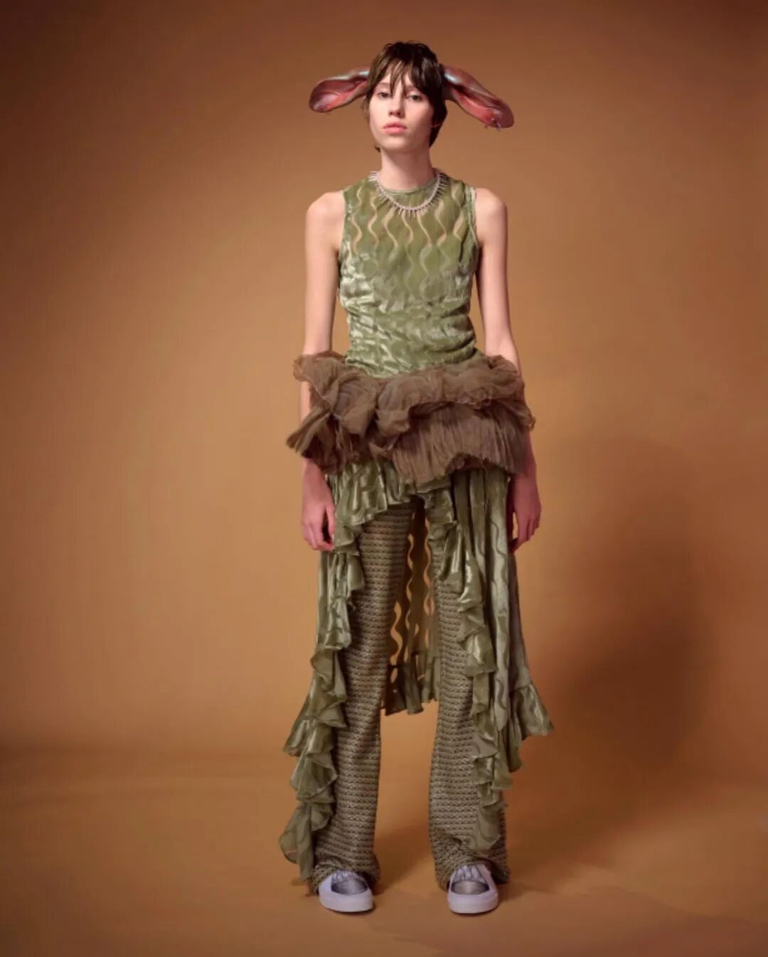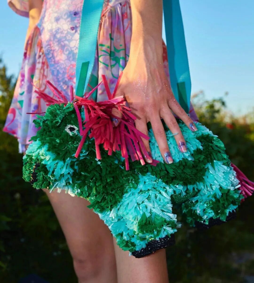 Collina Strada 2023AW此系列的主题是“请不要吃我的朋友”,设计师脑洞大开,将动物拟人化,模特们戴着动物假肢模型变身为蜥蜴、青蛙、牛、狗、兔子等动物,另一些则戴着可爱的耳朵或毛茸茸的尾巴,展现了一个奇幻有趣的动物PARTY,设计师想传达“地球上每个生物都是一体”。