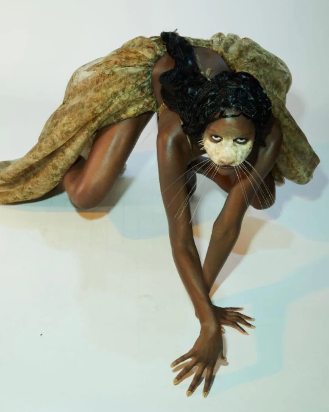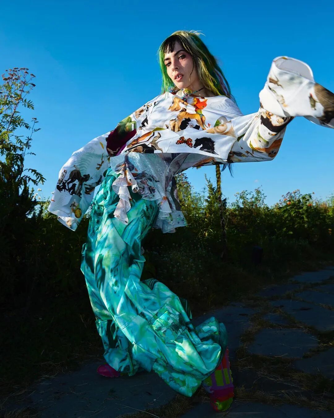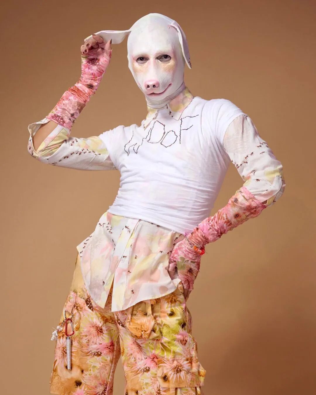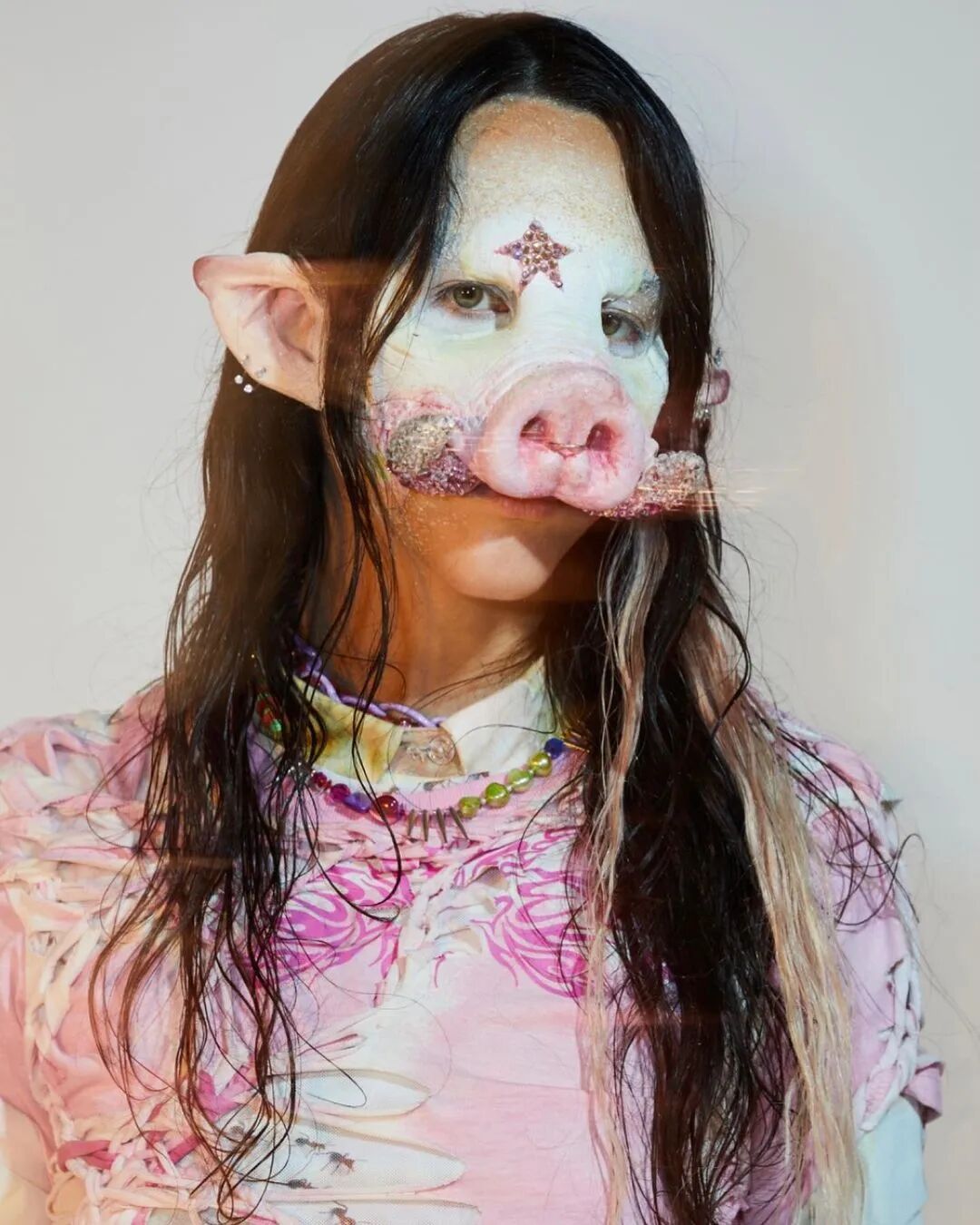 Collina Strada 2023AW此系列的主题是“请不要吃我的朋友”,设计师脑洞大开,将动物拟人化,模特们戴着动物假肢模型变身为蜥蜴、青蛙、牛、狗、兔子等动物,另一些则戴着可爱的耳朵或毛茸茸的尾巴,展现了一个奇幻有趣的动物PARTY,设计师想传达“地球上每个生物都是一体”。